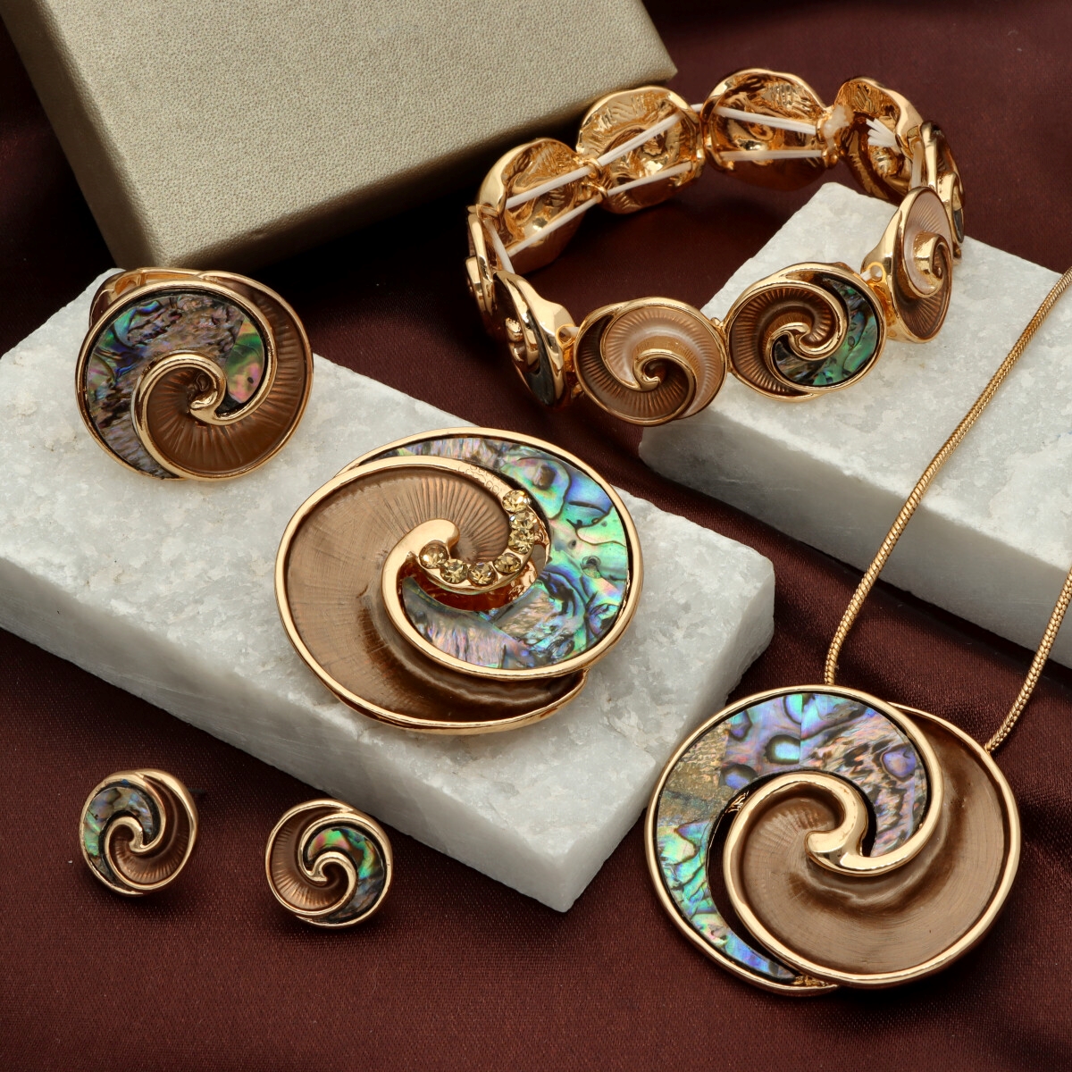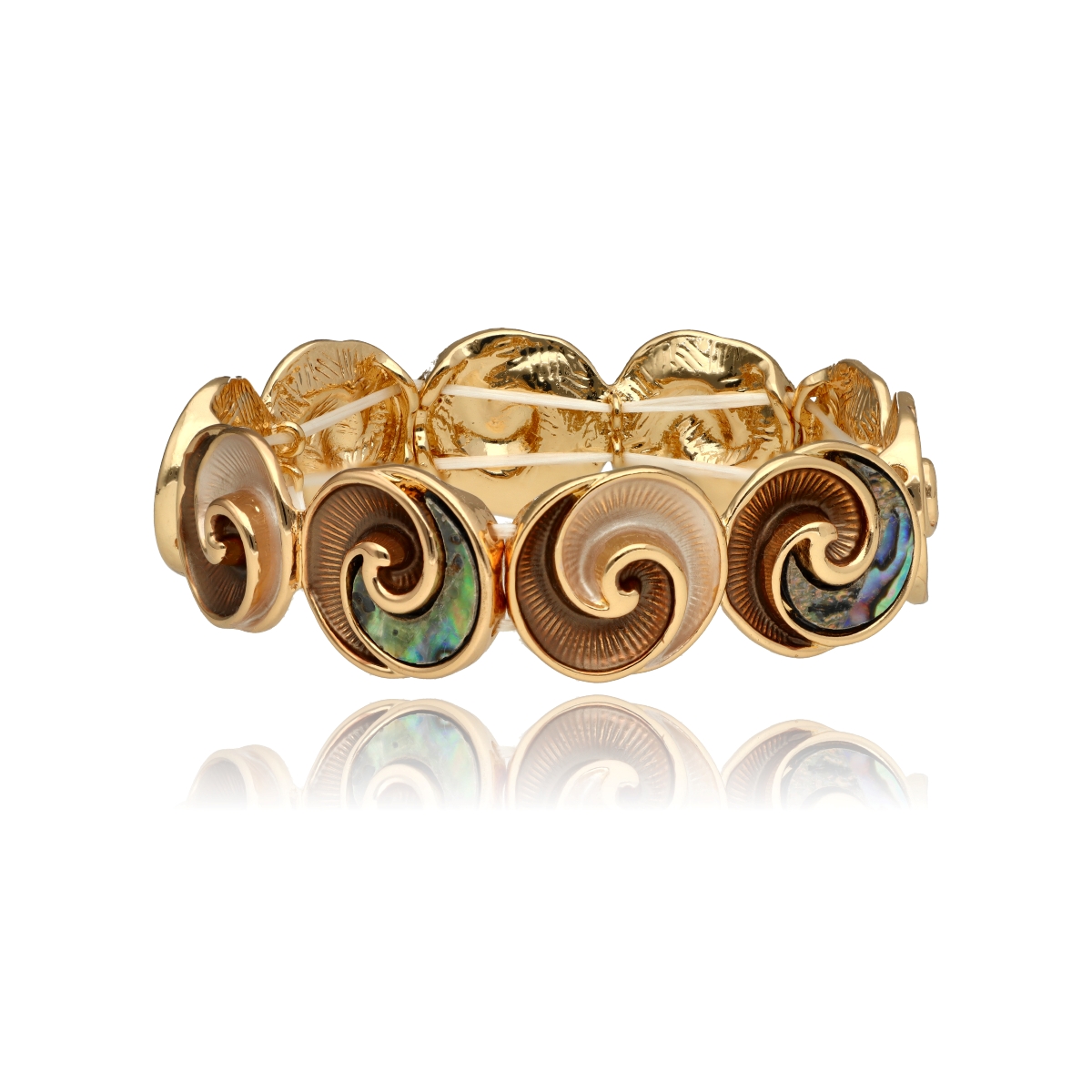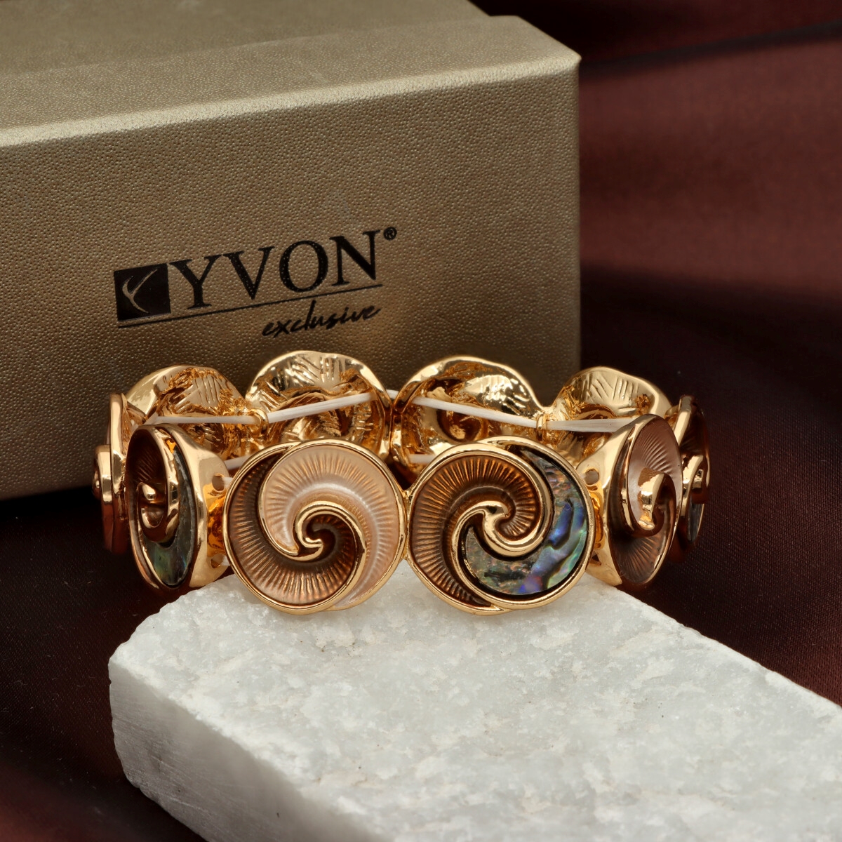 Bransoleta z kolekcji YVON BIŻUTERIA ARTYSTYCZNA, wykonana z metalu hipoalergicznego i zdobiona emaliowanymi elementami i muszlą naturalną ABALONE. Konstrukcja oparta na elastycznych gumeczkach dopasowuje się do każdego nadgarstka, zapewniając komfort noszenia. Wykończona z dbałością o detale, zachwyca artystycznym wzornictwem. Zapakowana w eleganckie pudełko prezentowe YVON – doskonały wybór zarówno do codziennych, jak i wieczorowych stylizacji.