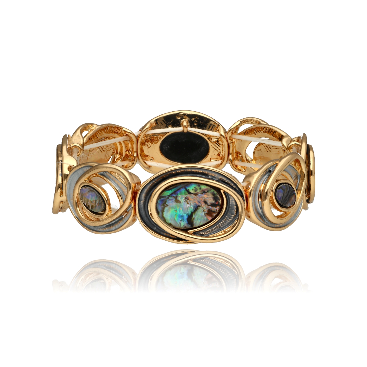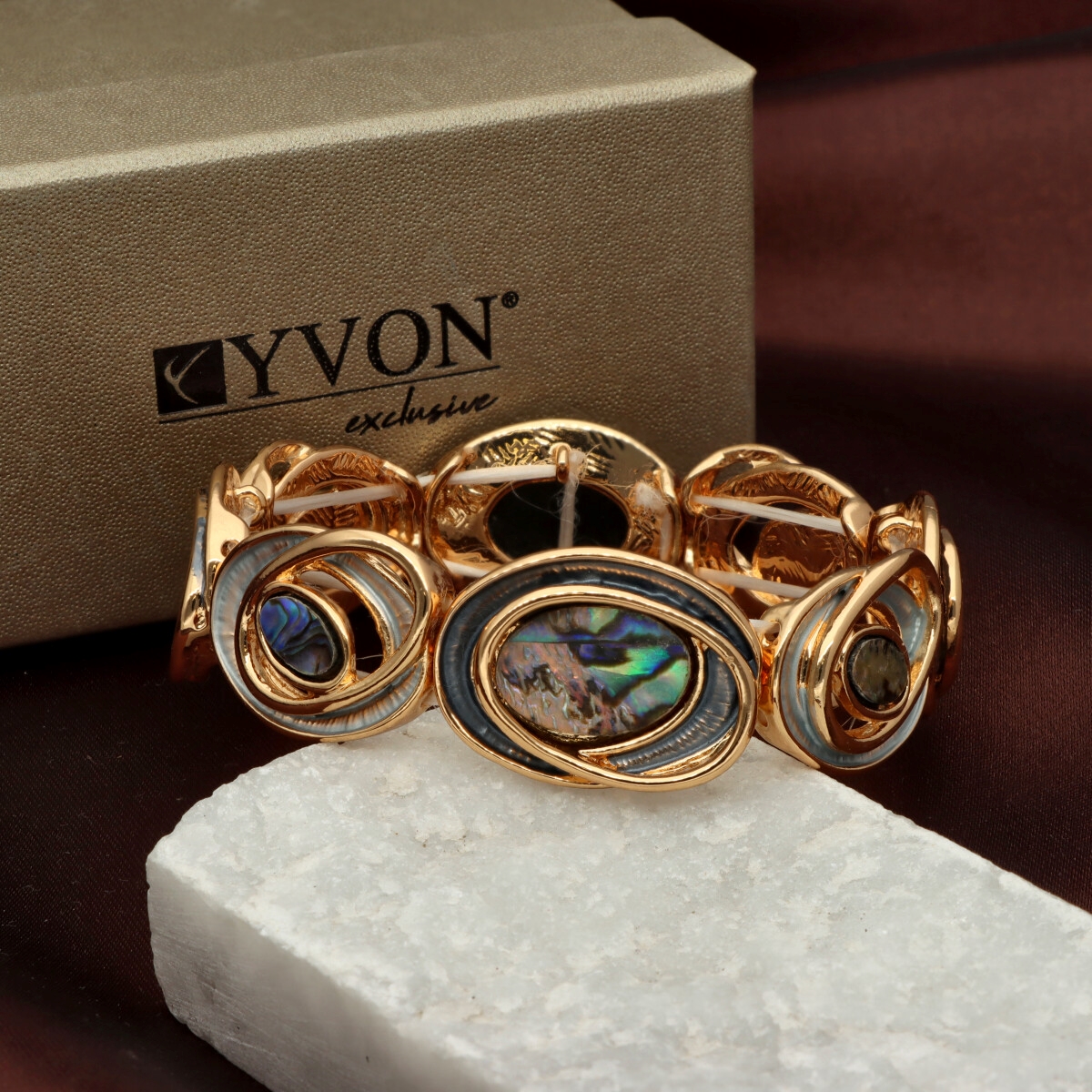Bransoleta z kolekcji YVON BIŻUTERIA ARTYSTYCZNA, wykonana z metalu hipoalergicznego i zdobiona emaliowanymi elementami i muszlą naturalną ABALONE. Konstrukcja oparta na elastycznych gumeczkach dopasowuje się do każdego nadgarstka, zapewniając komfort noszenia. Wykończona z dbałością o detale, zachwyca artystycznym wzornictwem. Zapakowana w eleganckie pudełko prezentowe YVON – doskonały wybór zarówno do codziennych, jak i wieczorowych stylizacji.