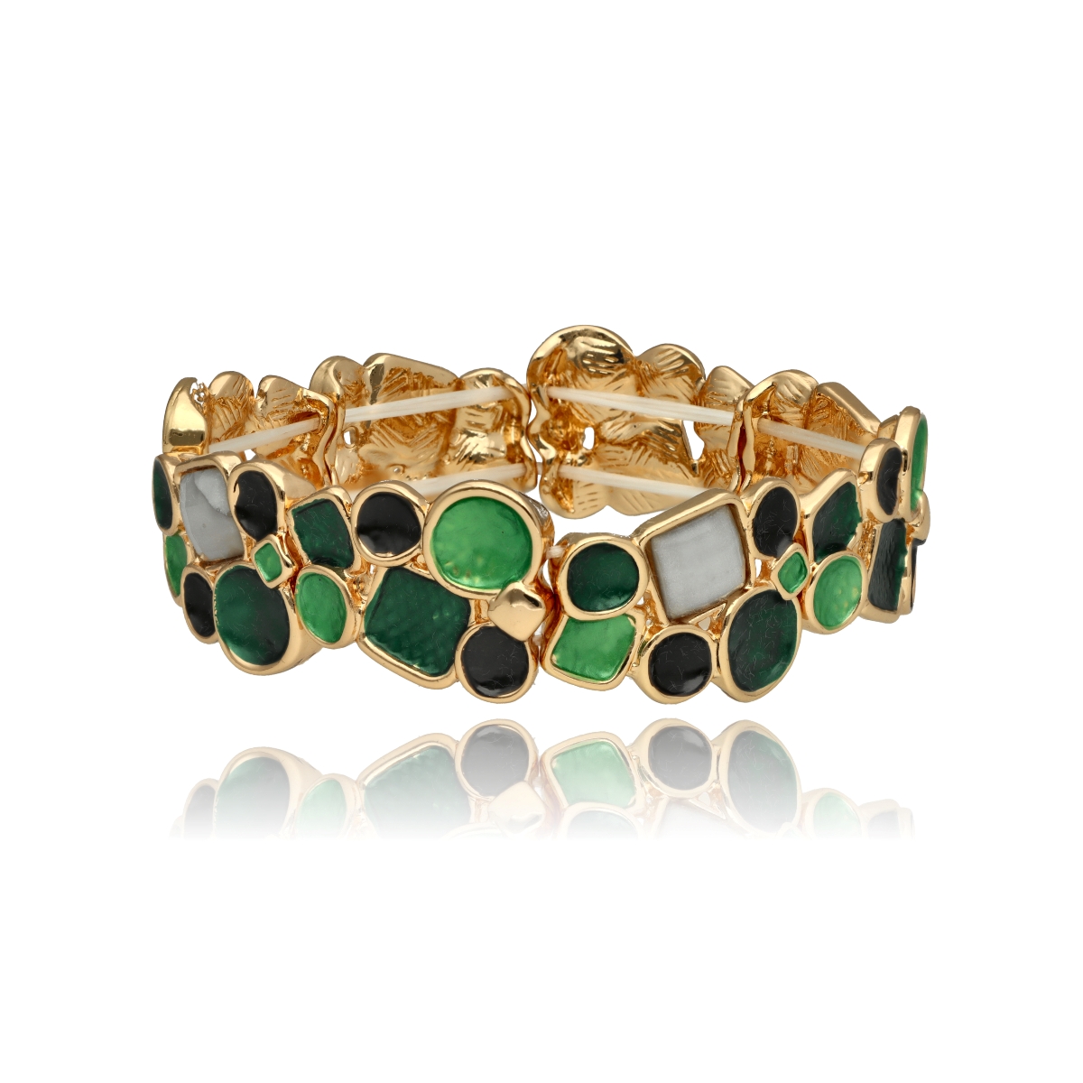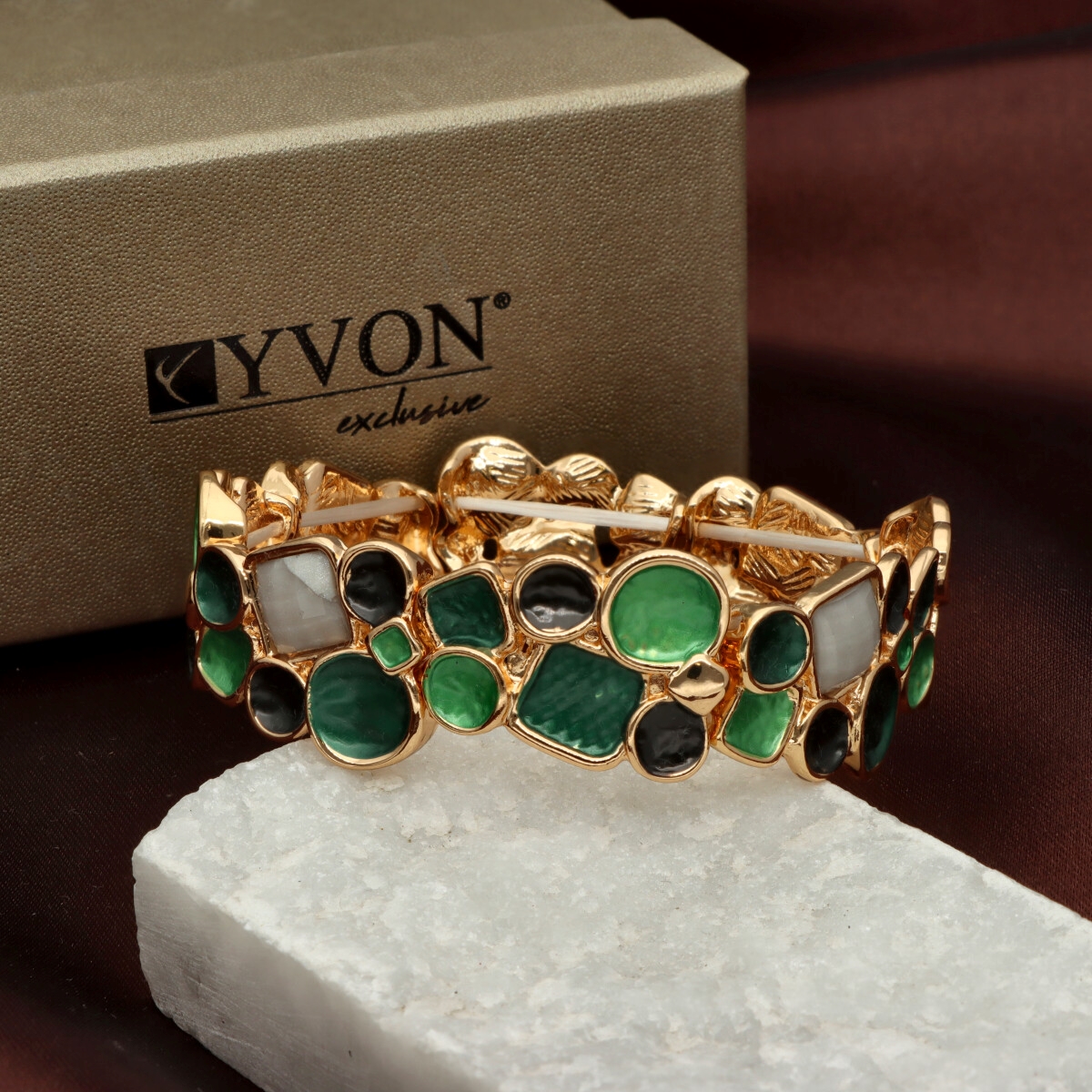 Bransoleta z kolekcji YVON BIŻUTERIA ARTYSTYCZNA, wykonana z metalu hipoalergicznego i zdobiona emaliowanymi elementami. Konstrukcja oparta na elastycznych gumeczkach dopasowuje się do każdego nadgarstka, zapewniając komfort noszenia. Wykończona z dbałością o detale, zachwyca artystycznym wzornictwem. Zapakowana w eleganckie pudełko prezentowe YVON – doskonały wybór zarówno do codziennych, jak i wieczorowych stylizacji.