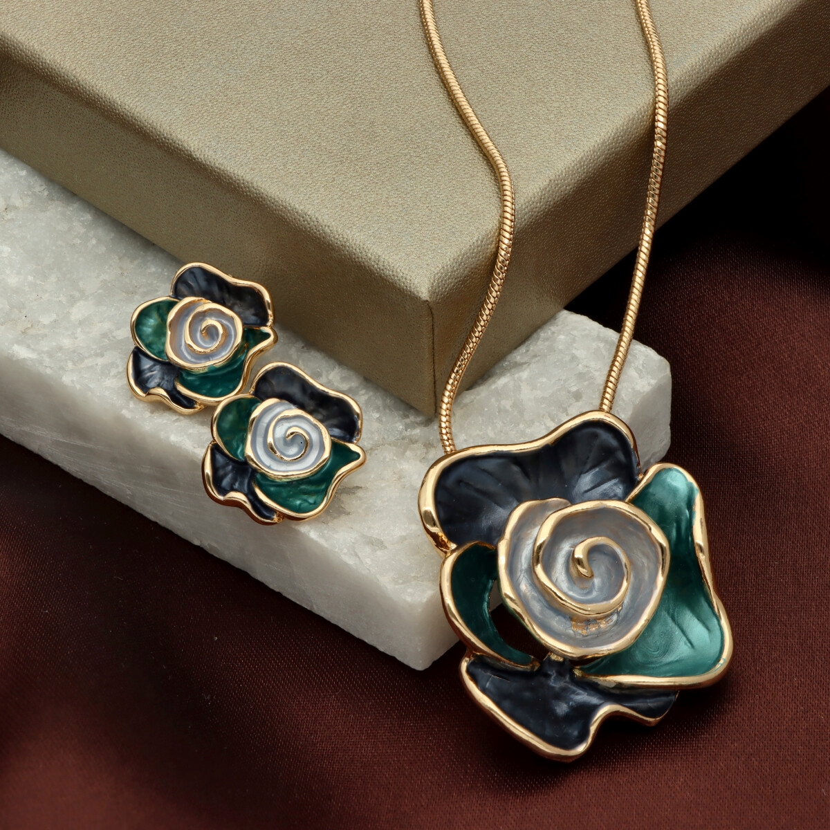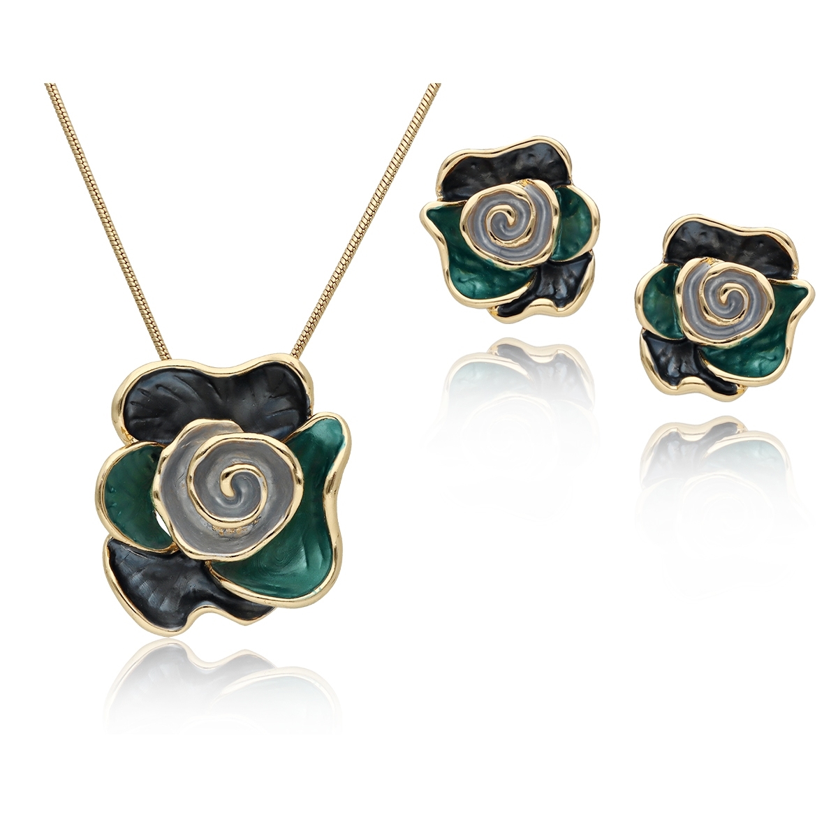 Komplet z kolekcji YVON BIŻUTERIA ARTYSTYCZNA, wykonany z metalu hipoalergicznego. Zdobiony emaliowanymi elementami, które tworzą elegancką, harmonijną kompozycję. Naszyjnik o długości 42 cm z możliwością regulacji o dodatkowe 8 cm, idealnie układa się na dekolcie. Kolczyki na wygodnym zapięciu typu sztyft. Całość zapakowana w eleganckie pudełko prezentowe YVON. To wyjątkowy komplet, który podkreśla kobiecą klasę i artystyczne wyczucie stylu.