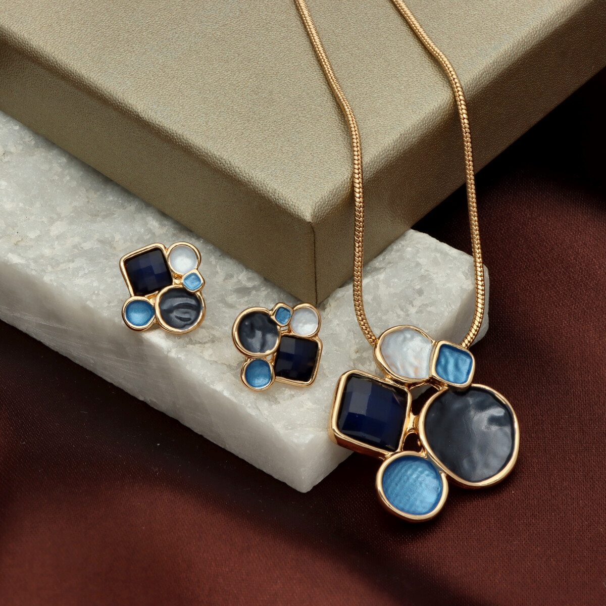 Komplet z kolekcji YVON BIŻUTERIA ARTYSTYCZNA, wykonany z metalu hipoalergicznego. Zdobiony emaliowanymi elementami, które tworzą elegancką, harmonijną kompozycję. Naszyjnik o długości 42 cm z możliwością regulacji o dodatkowe 8 cm, idealnie układa się na dekolcie. Kolczyki na wygodnym zapięciu typu sztyft. Całość zapakowana w eleganckie pudełko prezentowe YVON. To wyjątkowy komplet, który podkreśla kobiecą klasę i artystyczne wyczucie stylu.