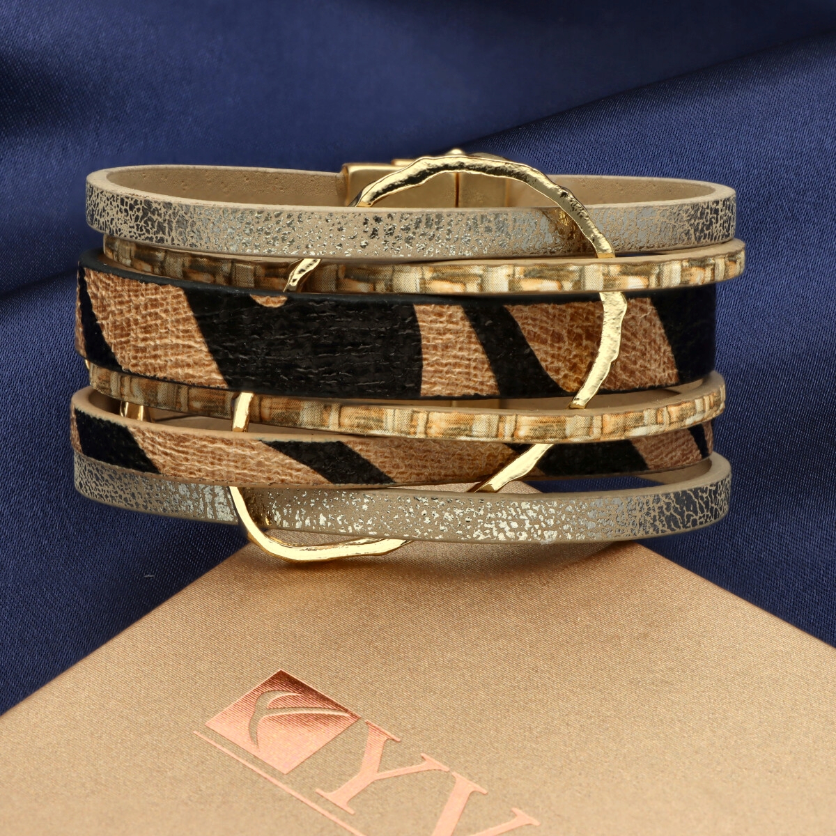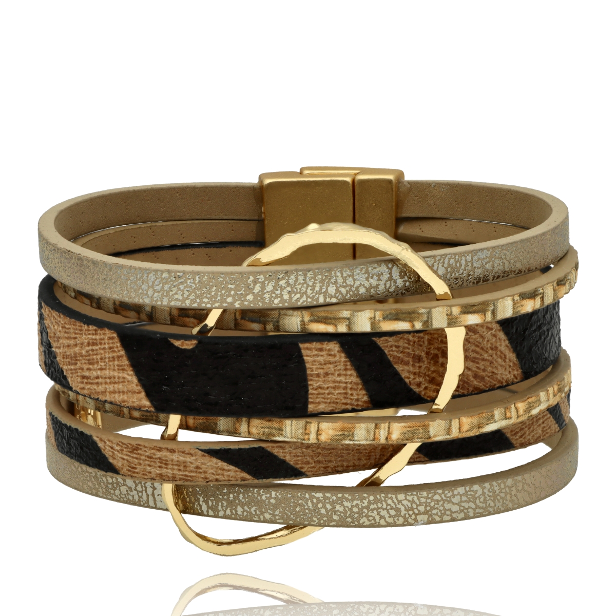 Elegancka bransoletka wykonana z wysokiej jakości skóry naturalnej i eko, zaprojektowana z myślą o nowoczesnych kobietach ceniących styl i wygodę. Wielowarstwowa struktura i metalowe akcenty nadają jej wyrazisty, ale ponadczasowy charakter.