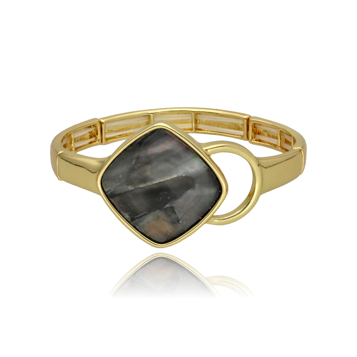 Stylowa bransoletka na elastycznej gumce, wykonana z metalowych, antyalergicznych elementów i muszli naturalnej szarej.