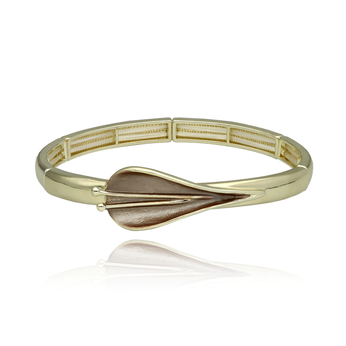 Bransoletka z ozdobnym motywem liścia, wykonana na rozciągliwych gumkach, co zapewnia wygodę i łatwe dopasowanie do nadgarstka.
