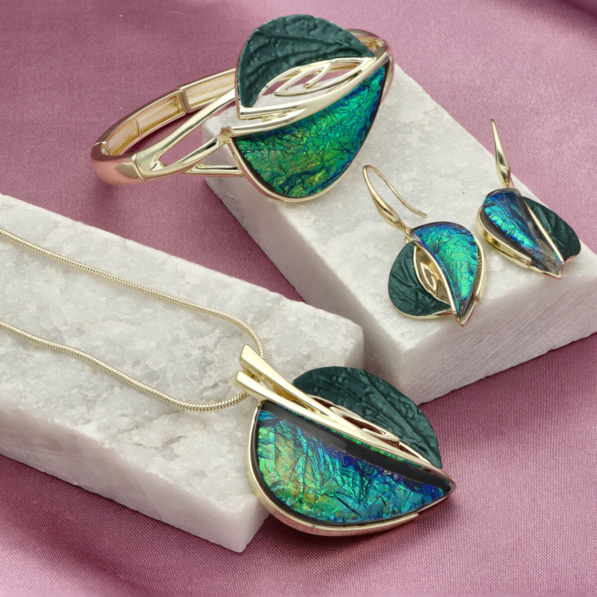 Wykonana z hipoalergicznego metalu (zamak – stop cynku, bezpieczny dla wrażliwej skóry), ozdobiona kolorową emalią oraz żywicą z efektem głębi, która mieni się jak opal i nadaje biżuterii wyjątkowego charakteru.