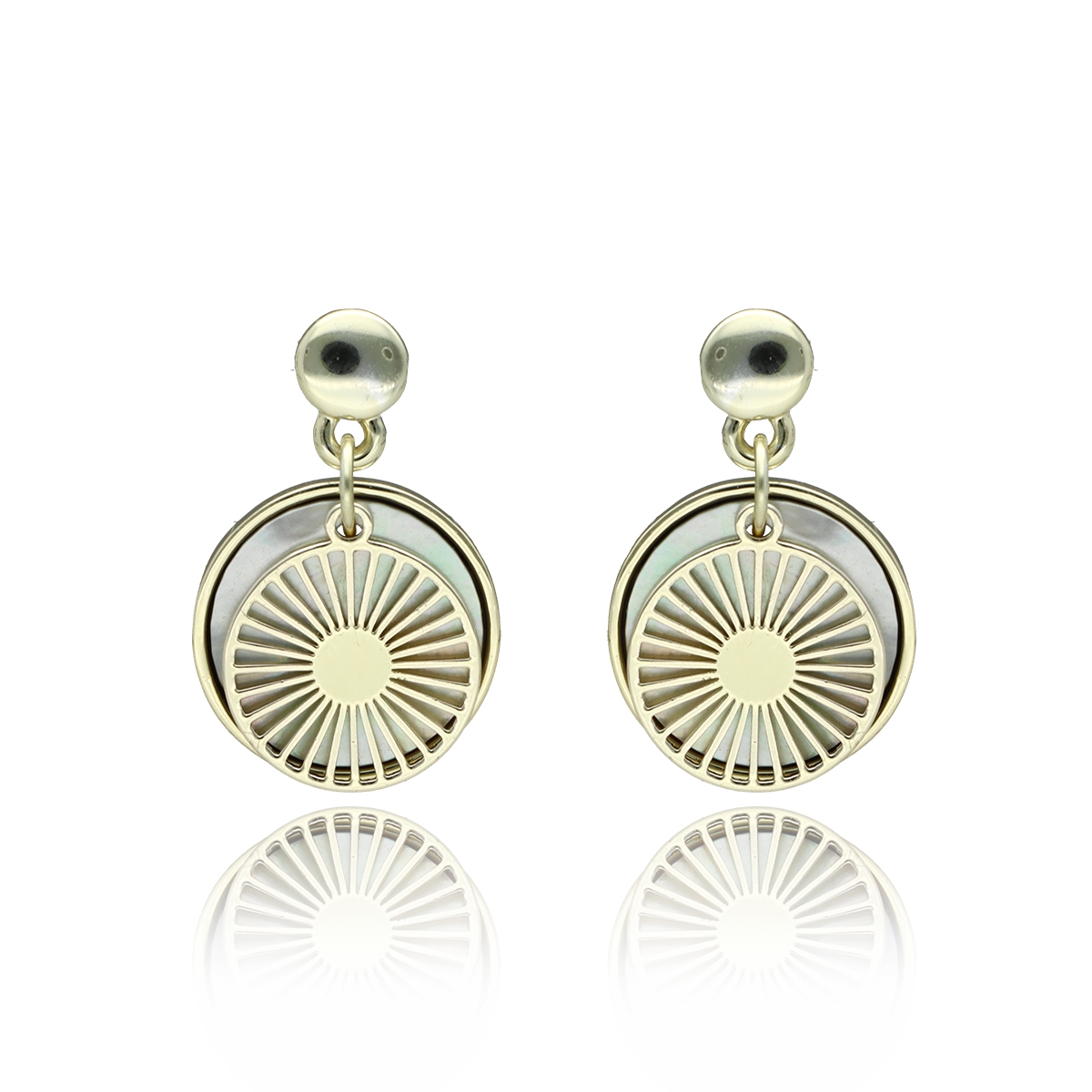 Eleganckie kolczyki wykonane z metalu antyalergicznego i muszli naturalnej szarej. Długosć ok. 3 cm. Szukaj do kompletu bransoletki i naszyjnika o tym samym indeksie numerycznym.