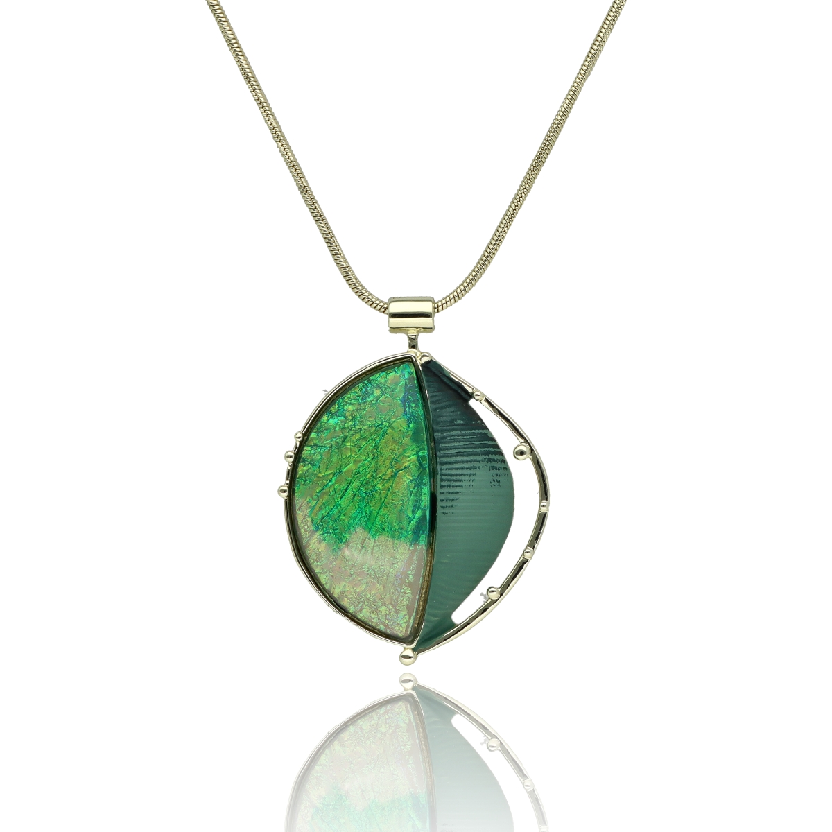 Naszyjnik wykonany z hipoalergicznego metalu (zamak – stop cynku, bezpieczny dla wrażliwej skóry), ozdobiony kolorową emalią oraz efektowną żywicą z wyraźnym efektem głębi, mieniącą się jak opal.