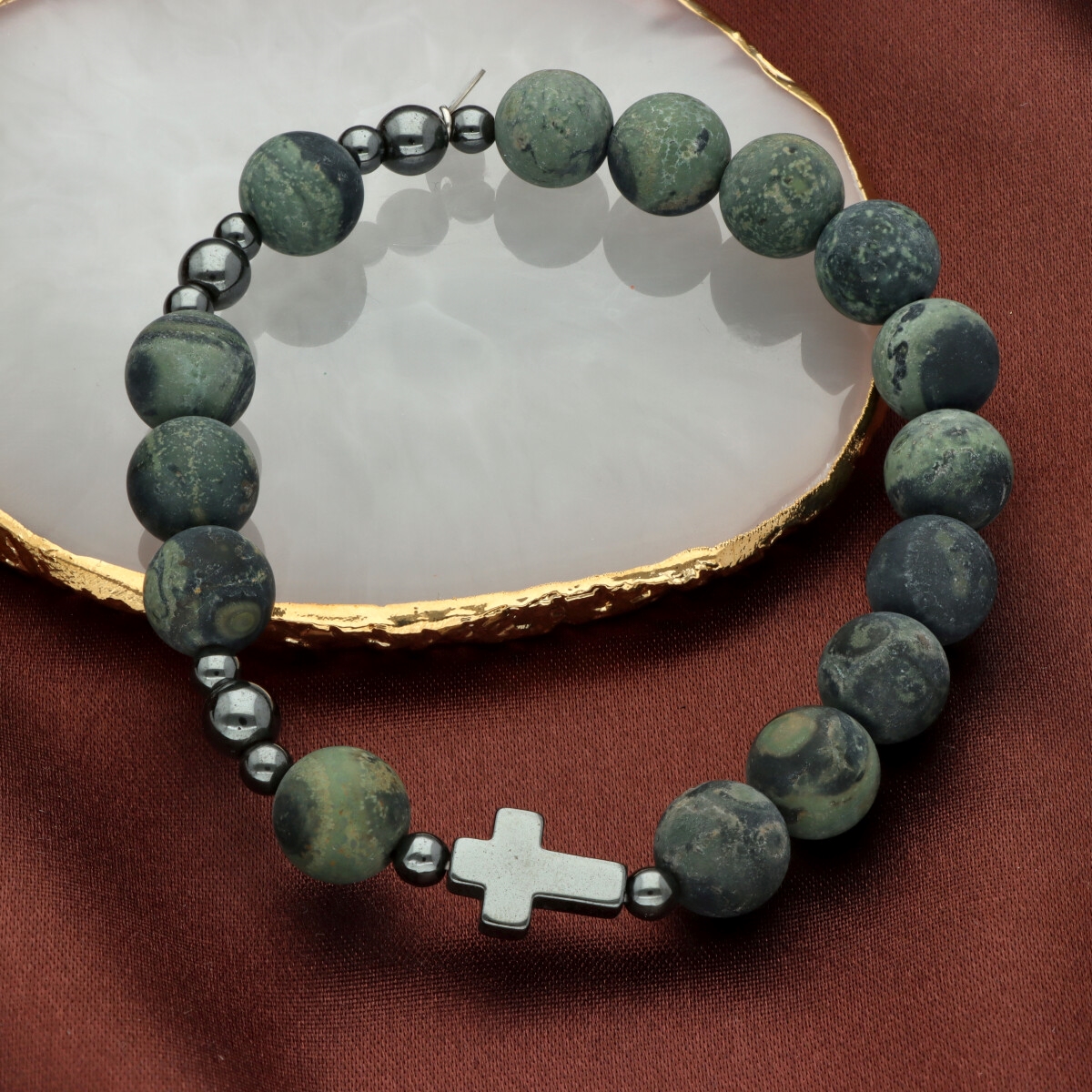 Różaniec na rękę męski, wykonany ze stali szlachetnej i kamieni naturalnych (hematyt, jaspis zielony Kambaba). Wielkość kamieni: 10 mm Zestaw w eleganckim pudełku i z sakiewką GRATIS.