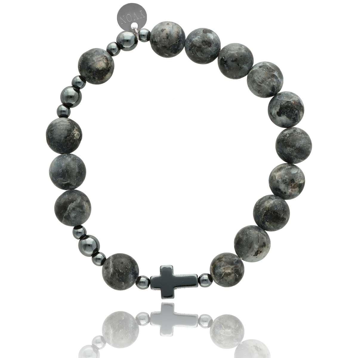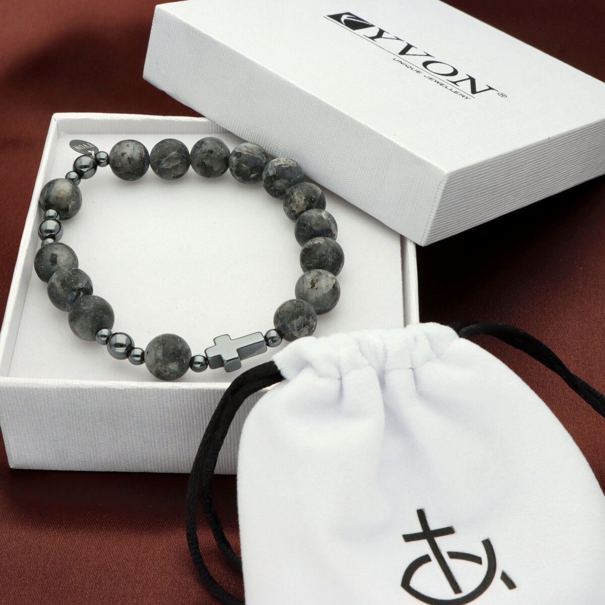 Różaniec na rękę męski, wykonany ze stali szlachetnej i kamieni naturalnych (hematyt, labradoryt). Wielkość kamieni: 10 mm Zestaw w eleganckim pudełku i z sakiewką GRATIS.