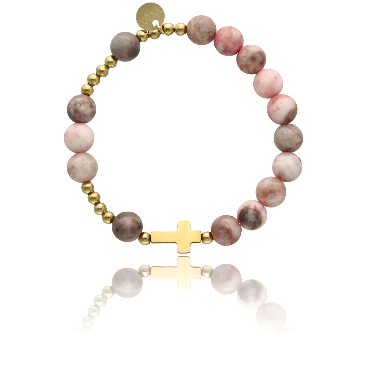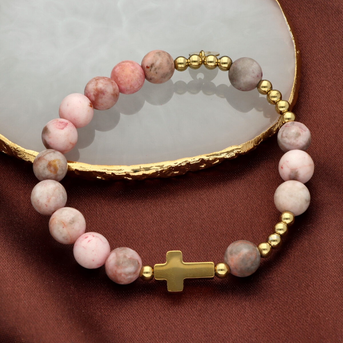 Różaniec na rękę damski, wykonany ze stali szlachetnej złoconej i kamieni naturalnych (opal pudrowy matowy).