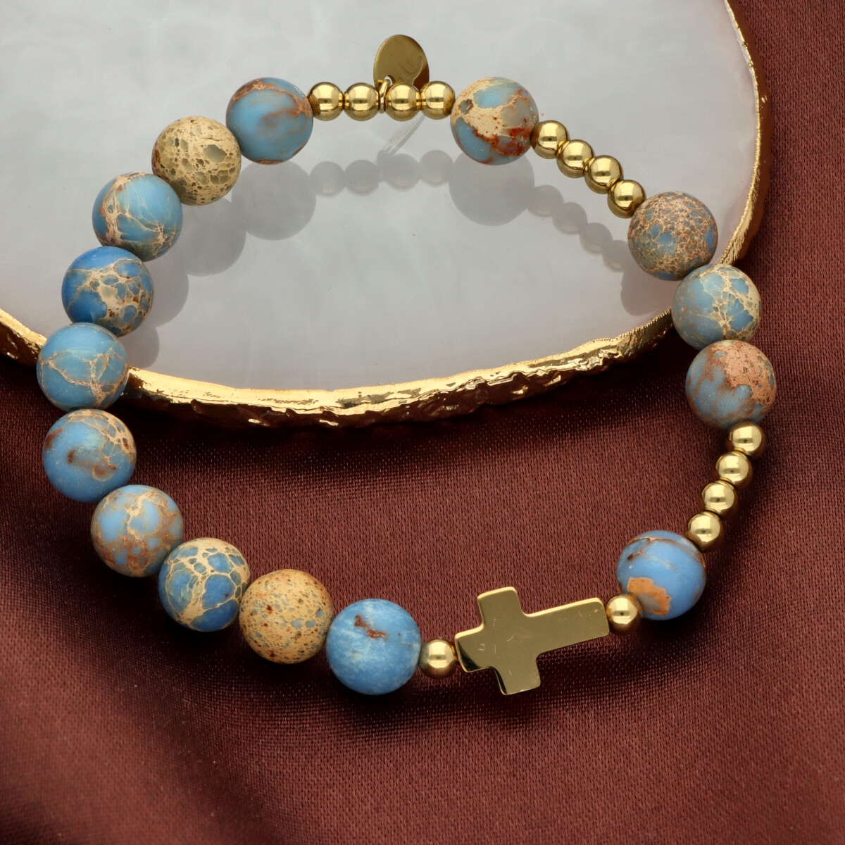 Różaniec na rękę damski, wykonany ze stali szlachetnej złoconej i kamieni naturalnych (turkus afrykański).