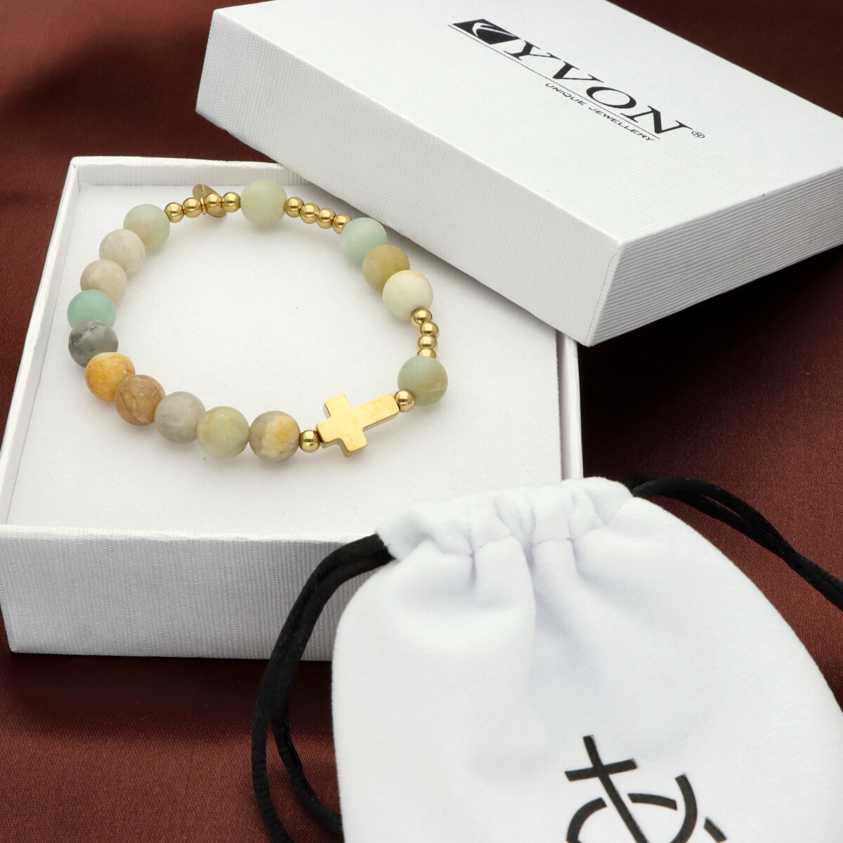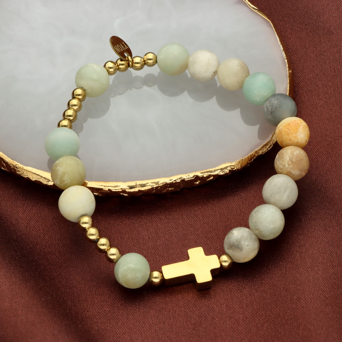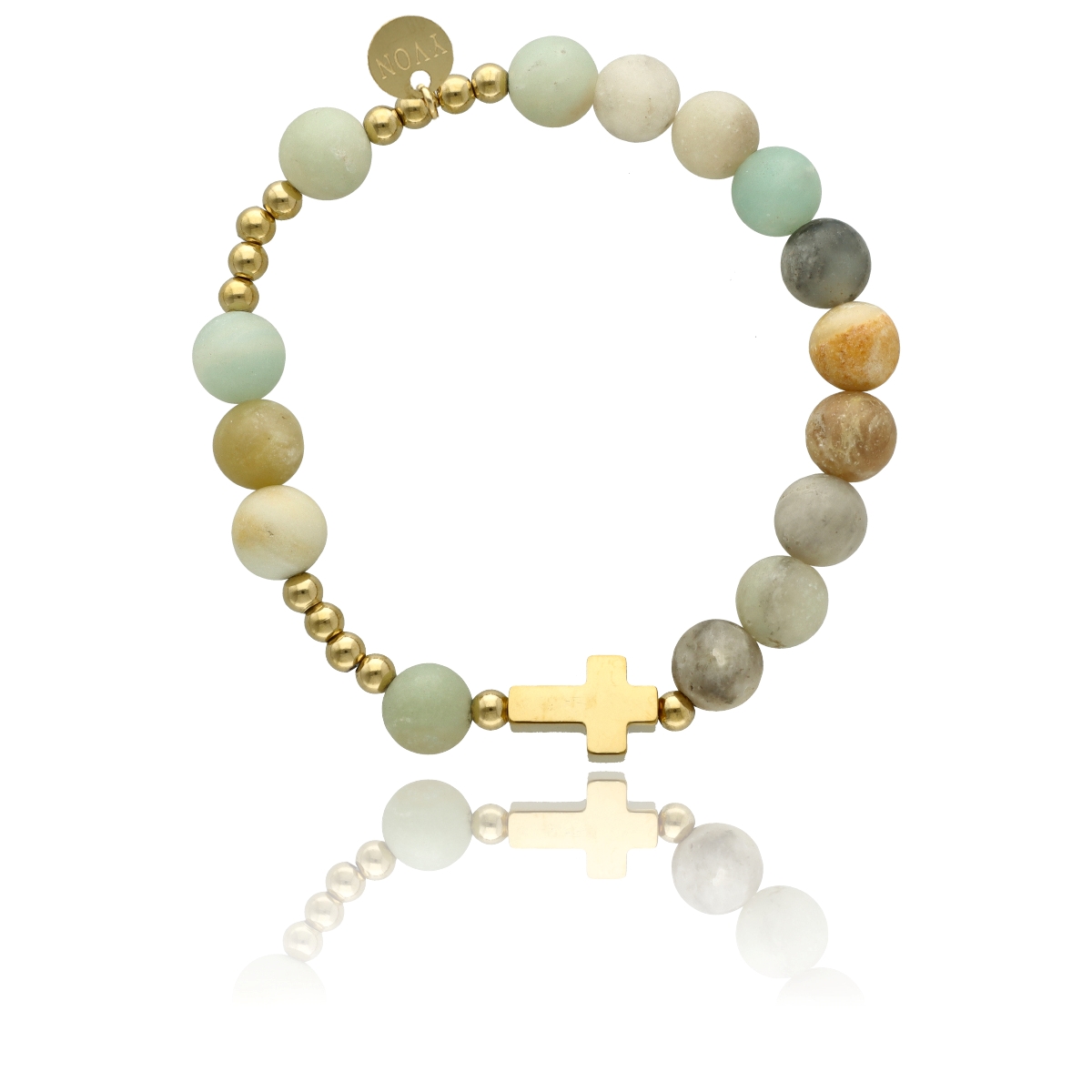 Różaniec na rękę damski, wykonany ze stali szlachetnej złoconej i kamieni naturalnych (amazonit matowy).