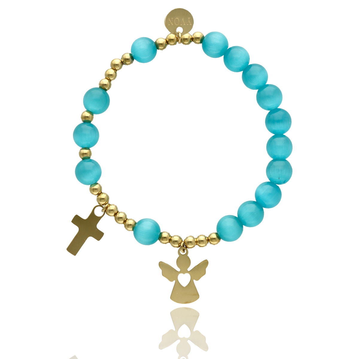 Różaniec na rękę damski, wykonany ze stali szlachetnej złoconej i kamieni naturalnych (selenit).