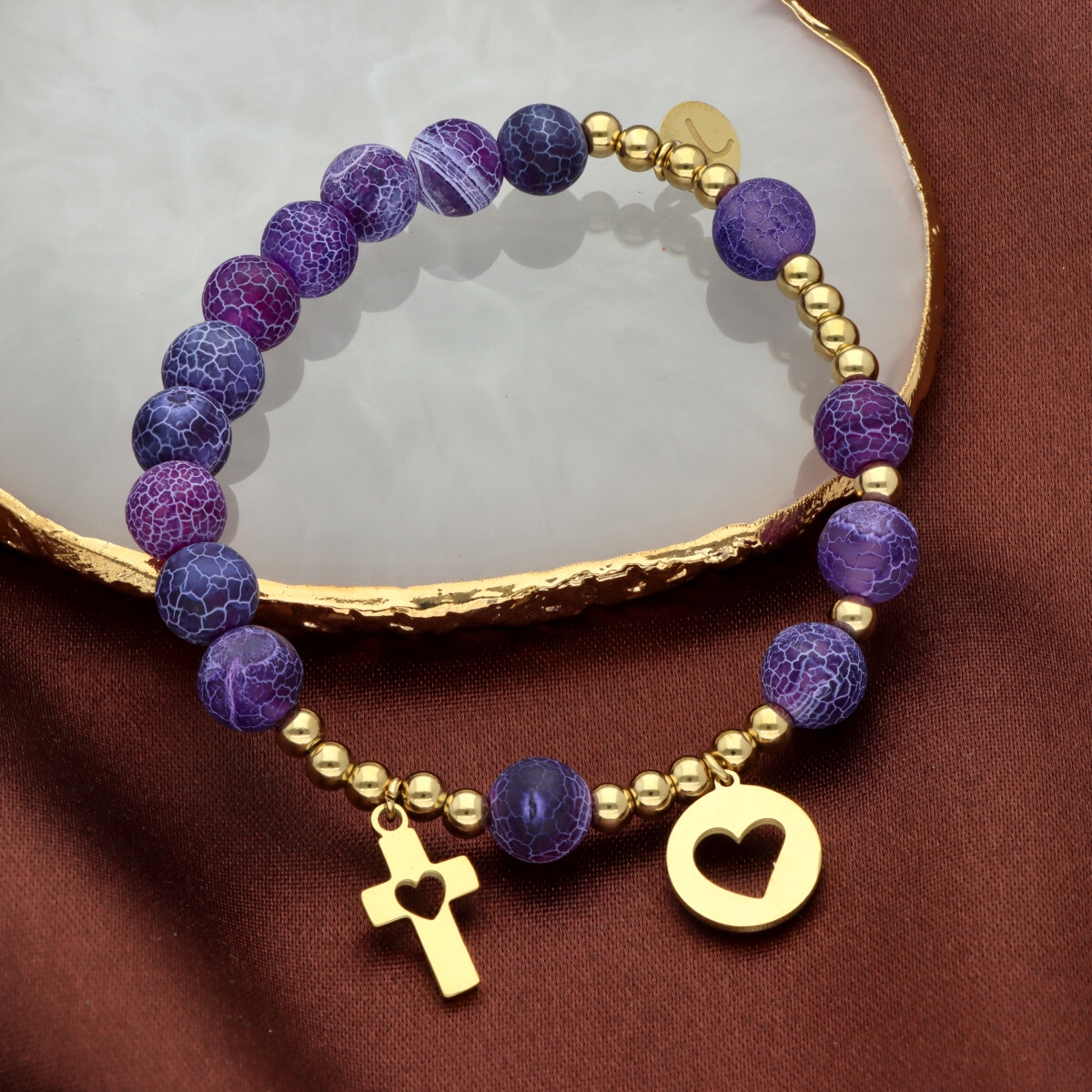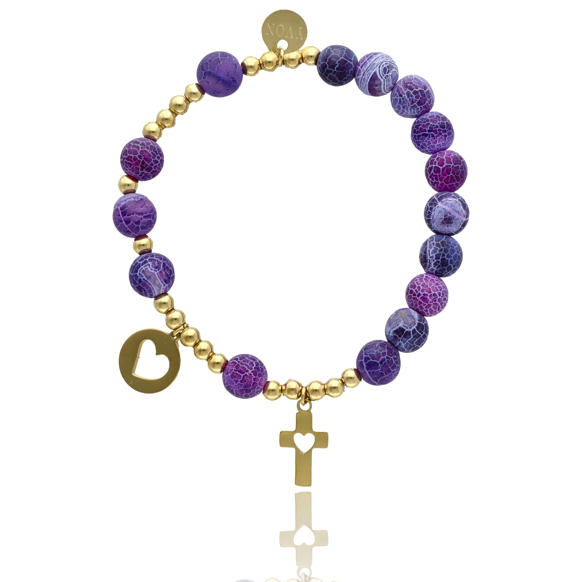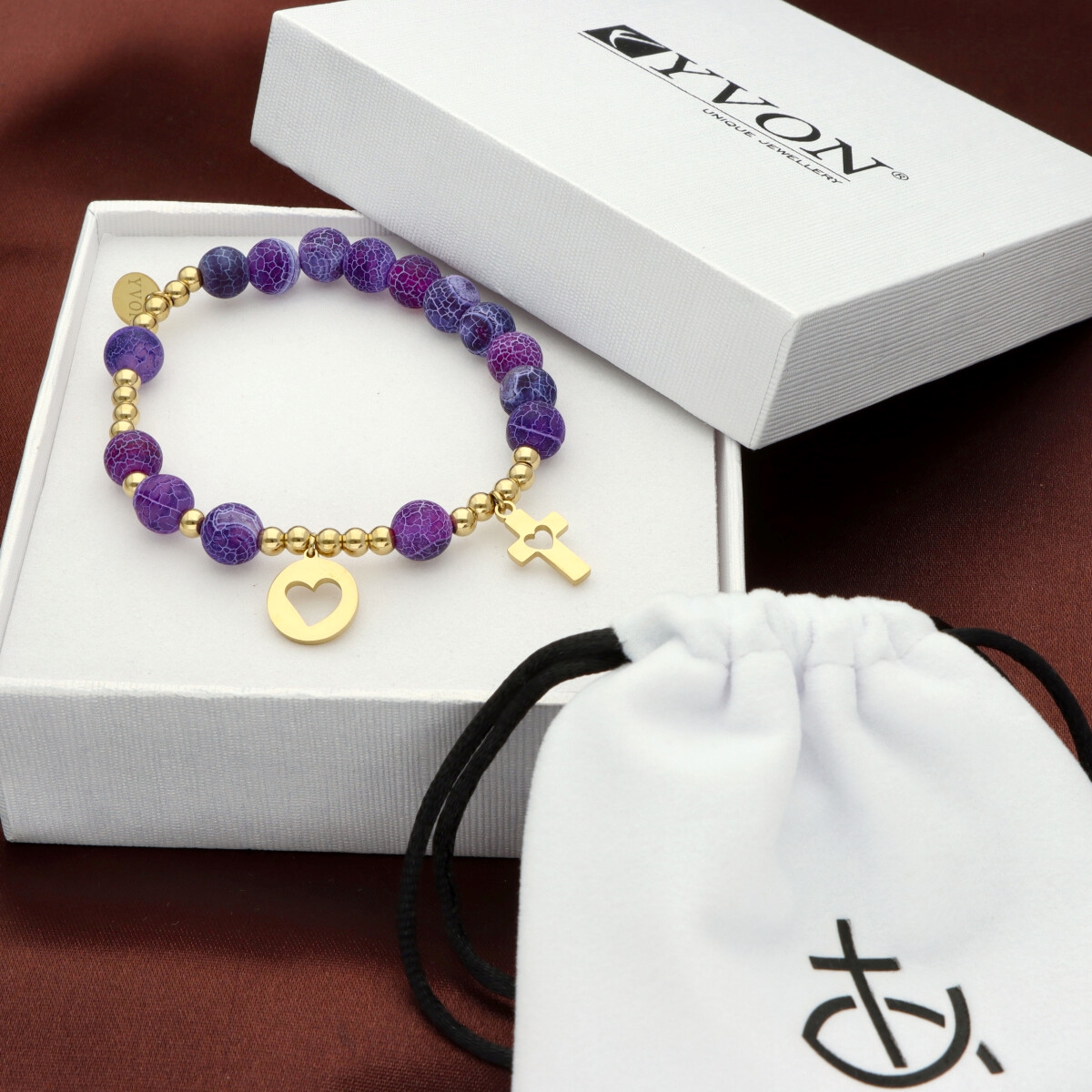 Różaniec na rękę damski, wykonany ze stali szlachetnej złoconej i kamieni naturalnych (agat purpurowy).