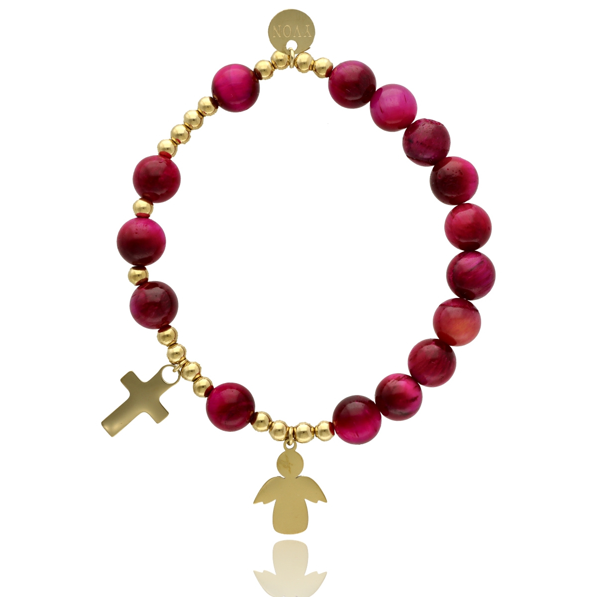 Różaniec na rękę damski, wykonany ze stali szlachetnej złoconej i kamieni naturalnych (tygrysie oko różowe).