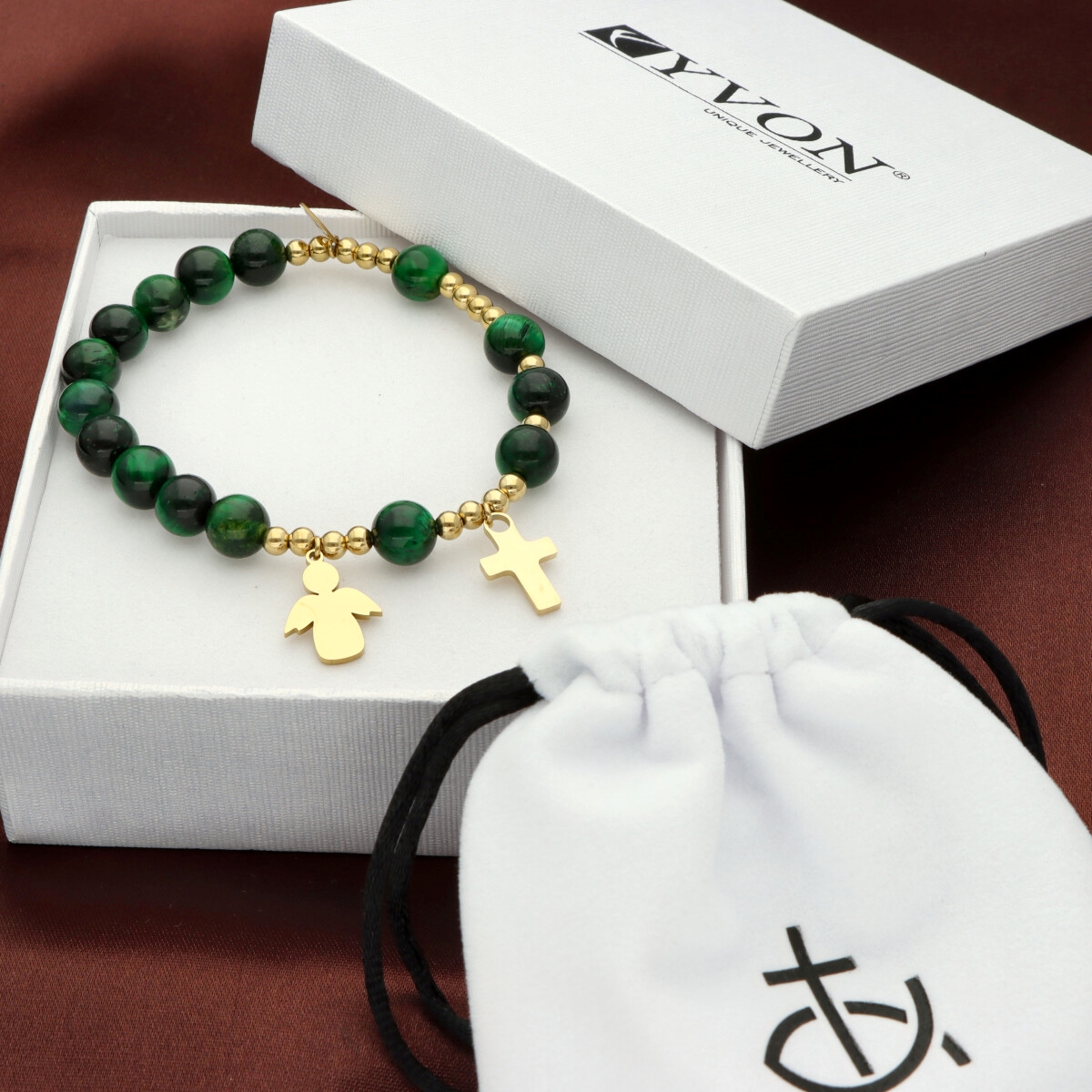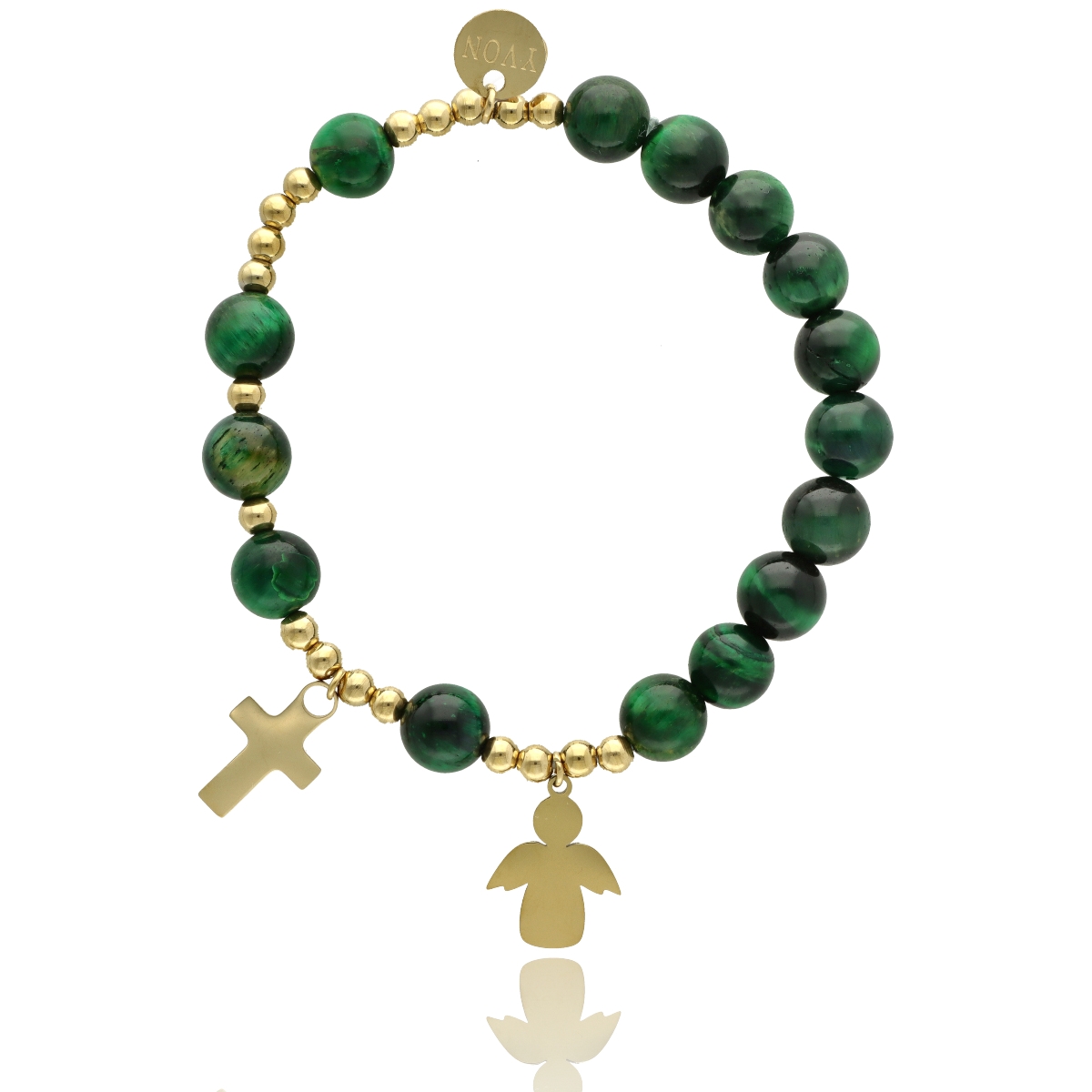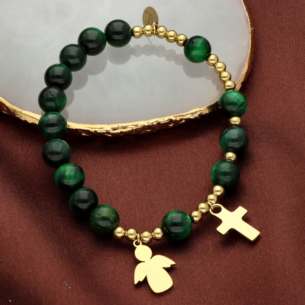 Różaniec na rękę damski, wykonany ze stali szlachetnej złoconej i kamieni naturalnych (tygrysie oko zielone).