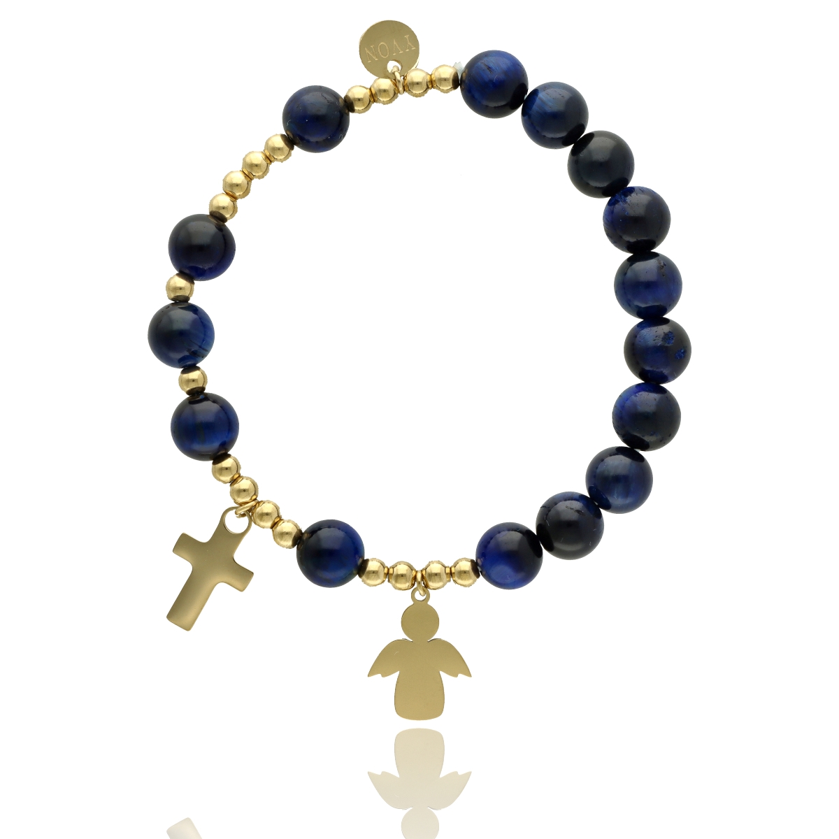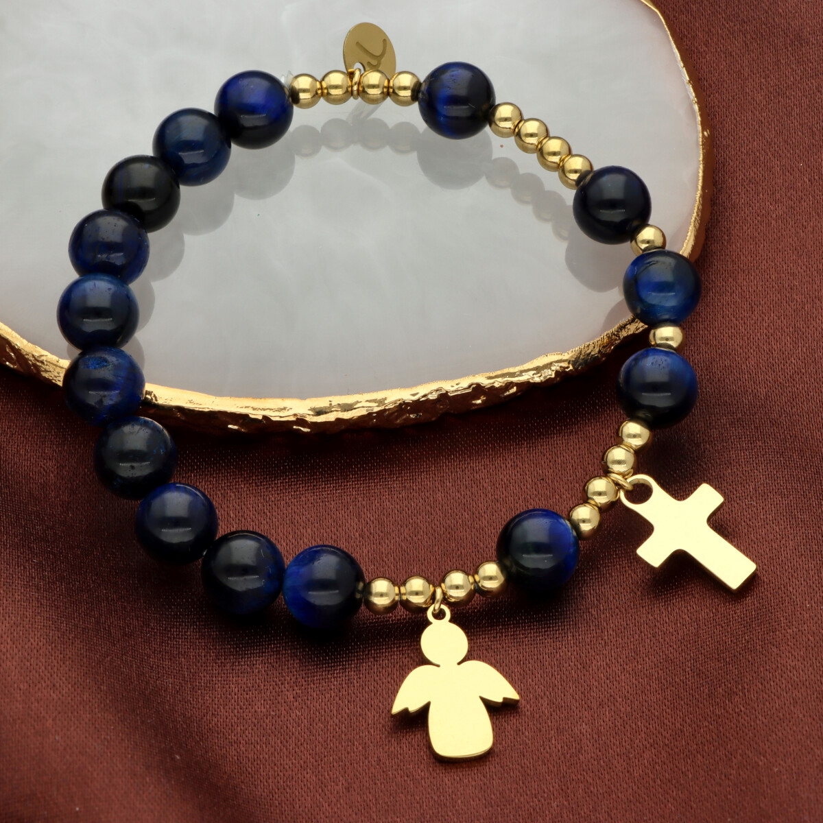 Różaniec na rękę damski, wykonany ze stali szlachetnej złoconej i kamieni naturalnych (tygrysie oko niebieskie).
