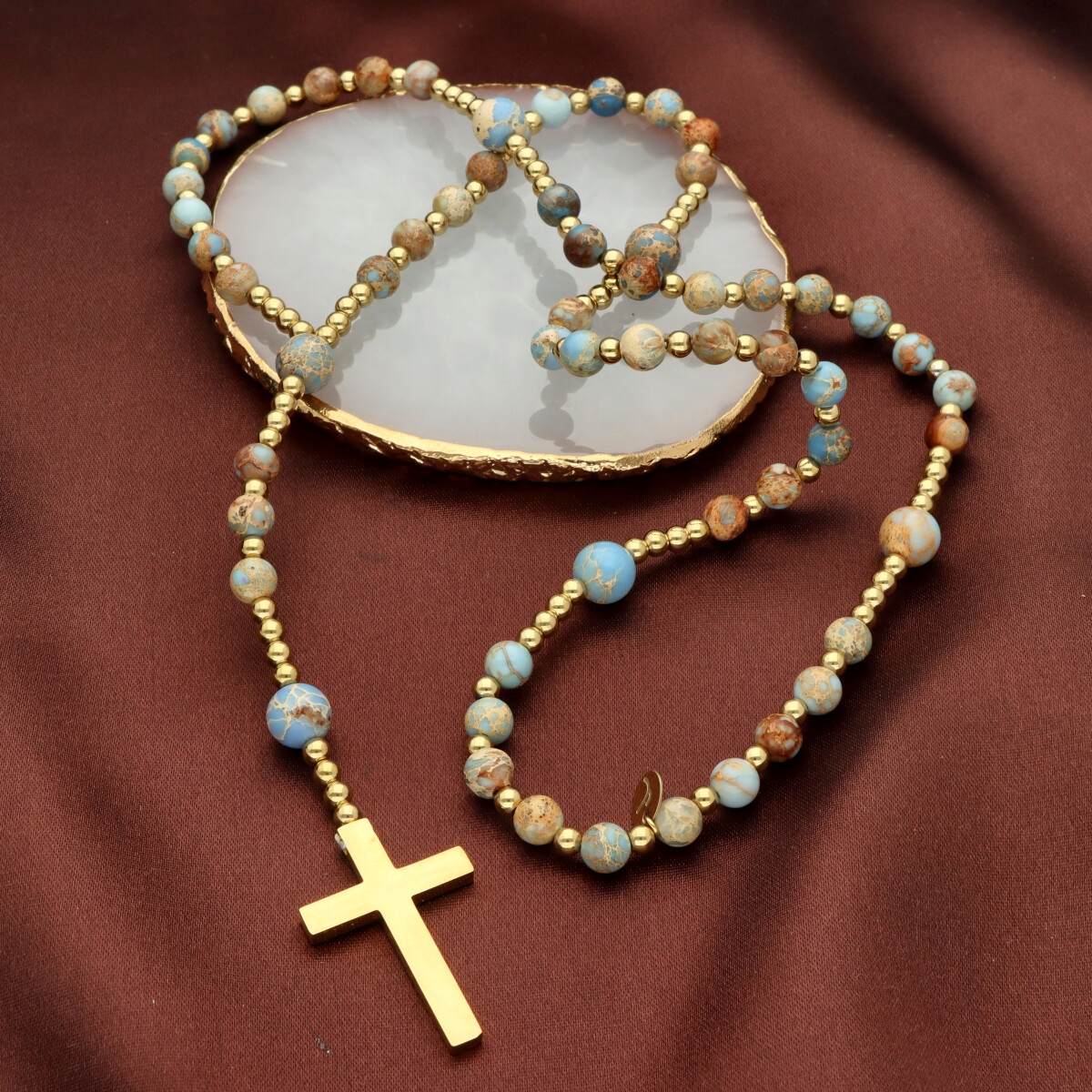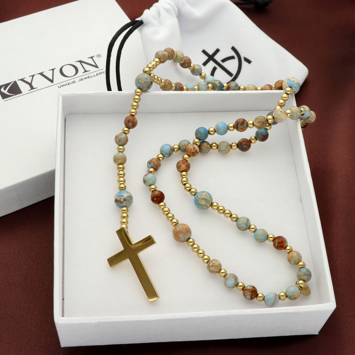 Różaniec wykonany ze stali szlachetnej złoconej i kamieni naturalnych (jaspis cesaski). Wielkość kamieni: 6 i 8 mm Zestaw w eleganckim pudełku i z sakiewką GRATIS. Idealny pomysł na Komunię Świętą.