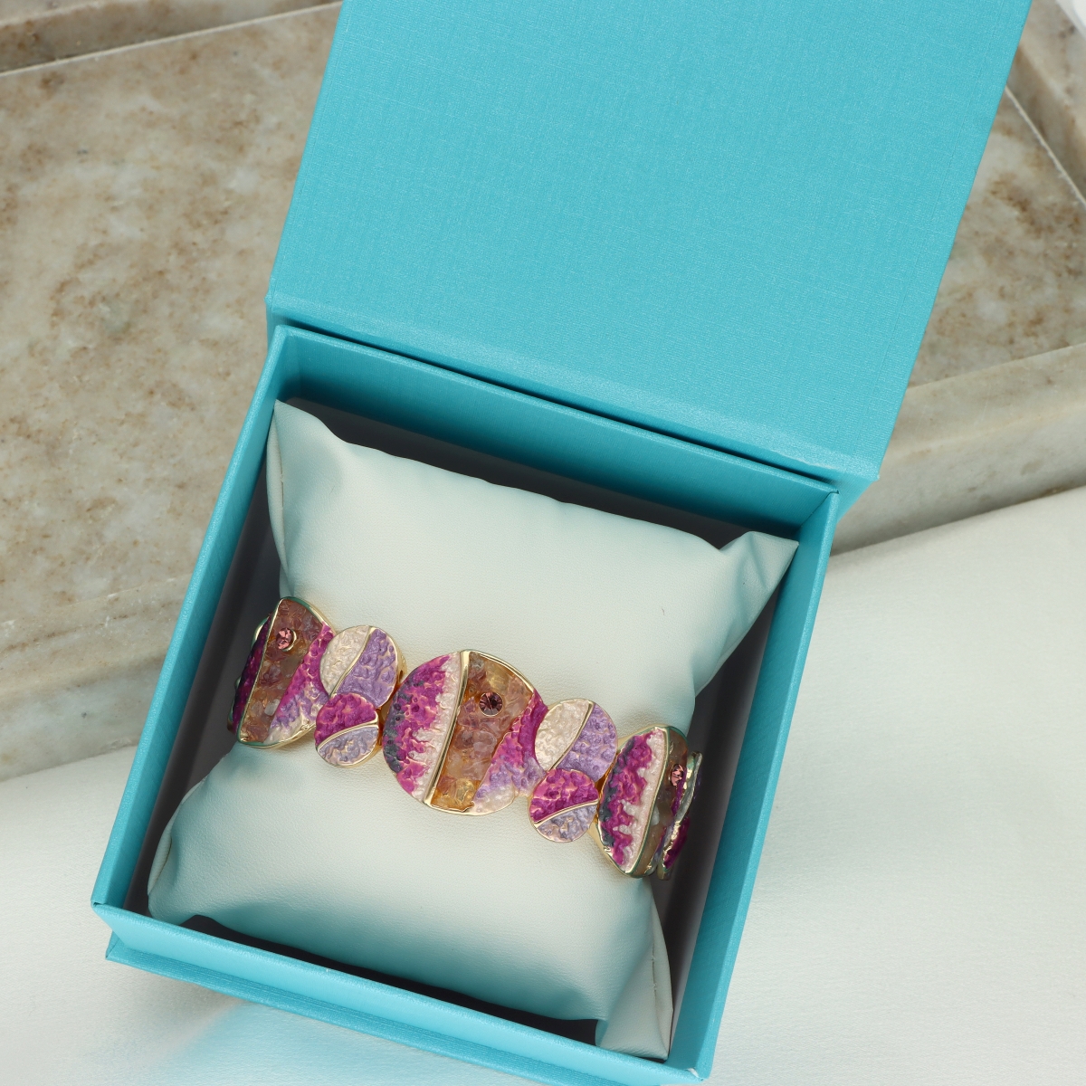 Bransoletka wykonana w konwencji biżuterii artystycznej. Ręcznie emaliowana. Rozmiar uniwersalny. Całość wykonana z antyalergicznego metalu. W eleganckim pudełku. Szukaj do kompletu naszyjnika i kolczyków o tym samym indeksie numerycznym.