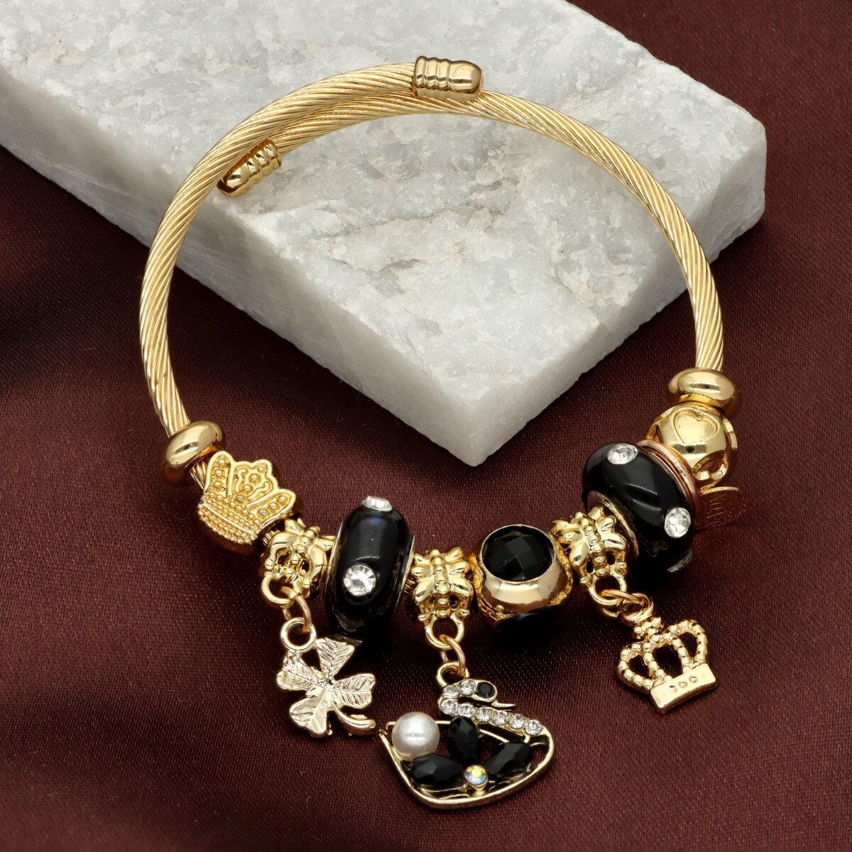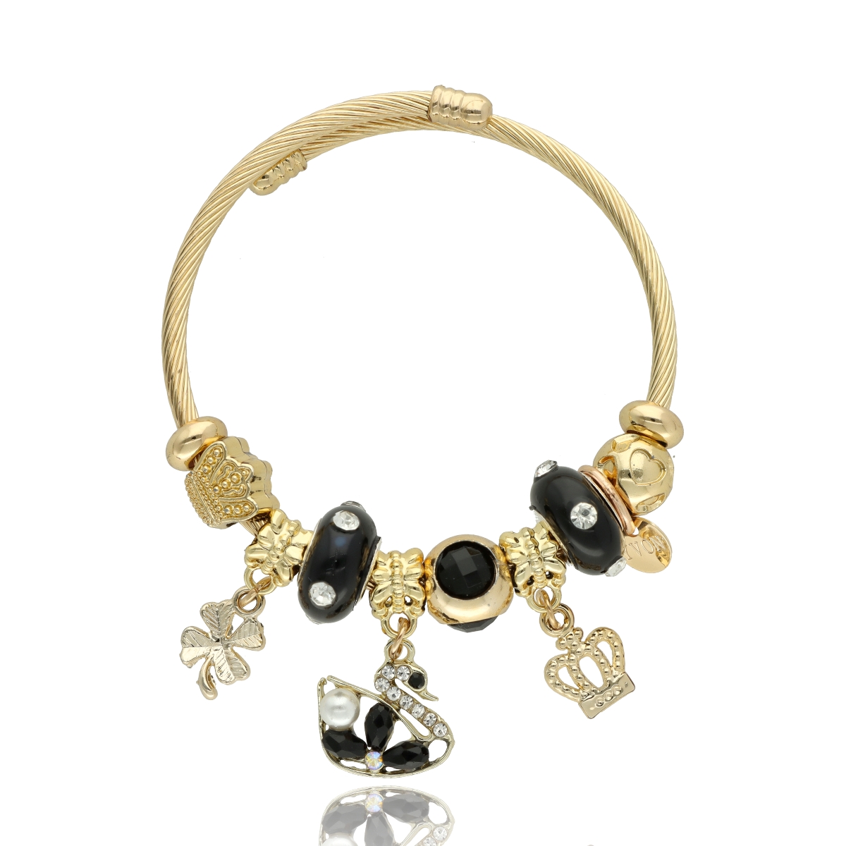 Urocza bransoletka wykonana ze stali szlachetnej (obręcz) oraz zamaku, szkła fasetowanego, ceramiki i emalii (czarmsy). W eleganckim PUDEŁECZKU GRATIS - idealny pomysł na prezent. Biżuteria hypoalergiczna.