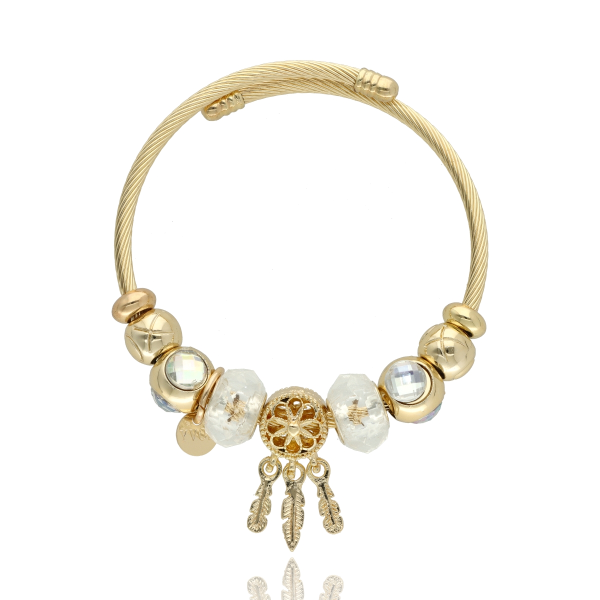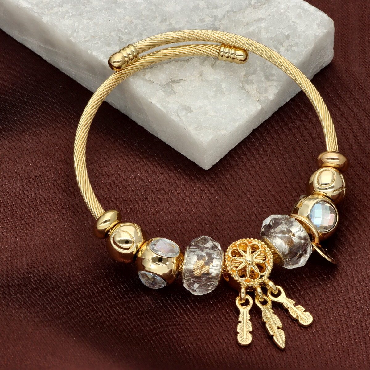 Urocza bransoletka wykonana ze stali szlachetnej (obręcz) oraz zamaku, szkła fasetowanego, ceramiki i emalii (czarmsy). W eleganckim PUDEŁECZKU GRATIS - idealny pomysł na prezent.