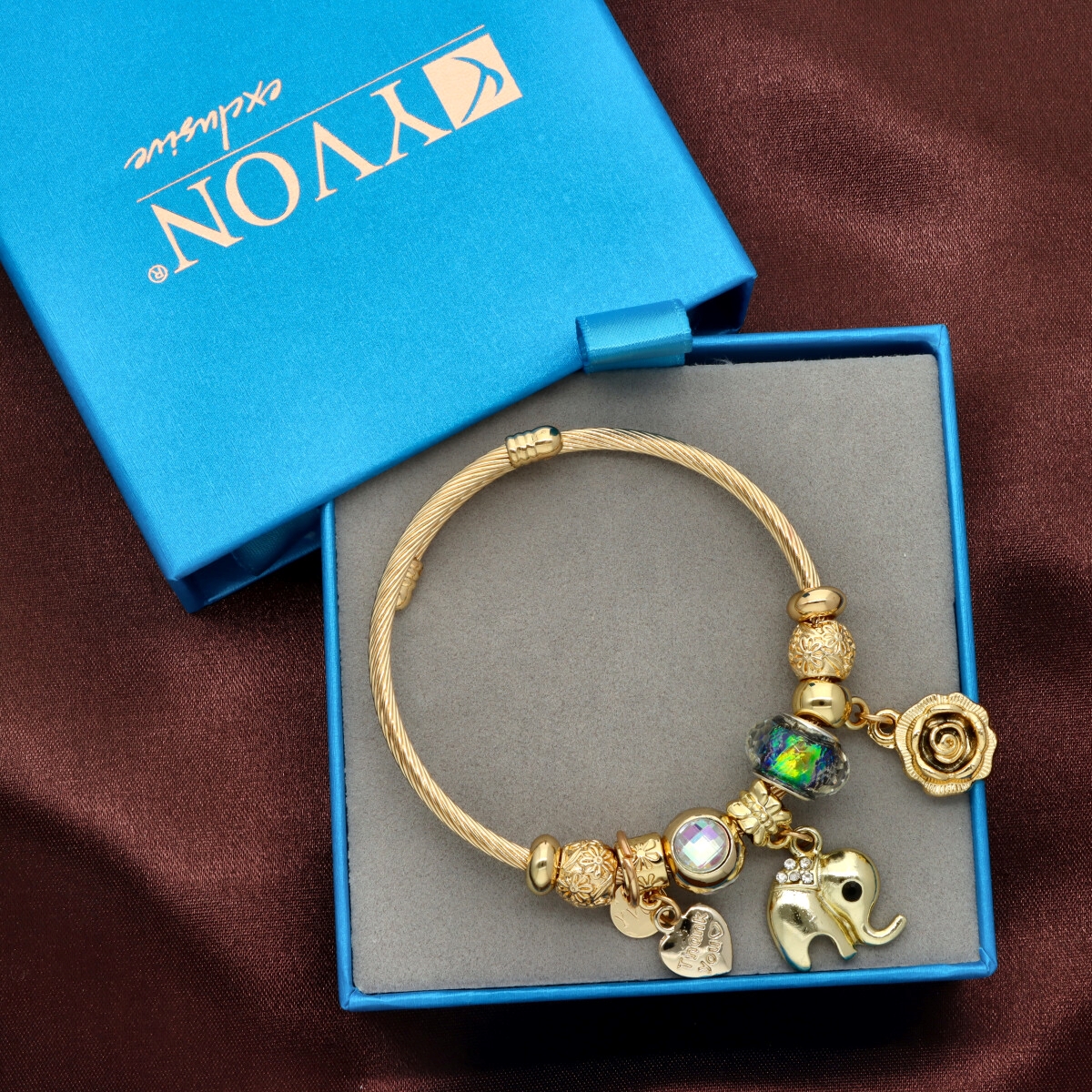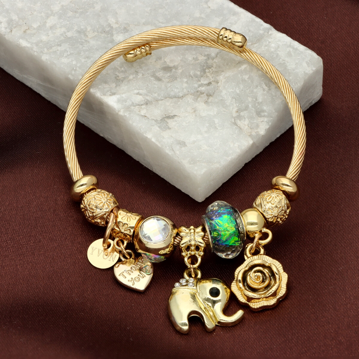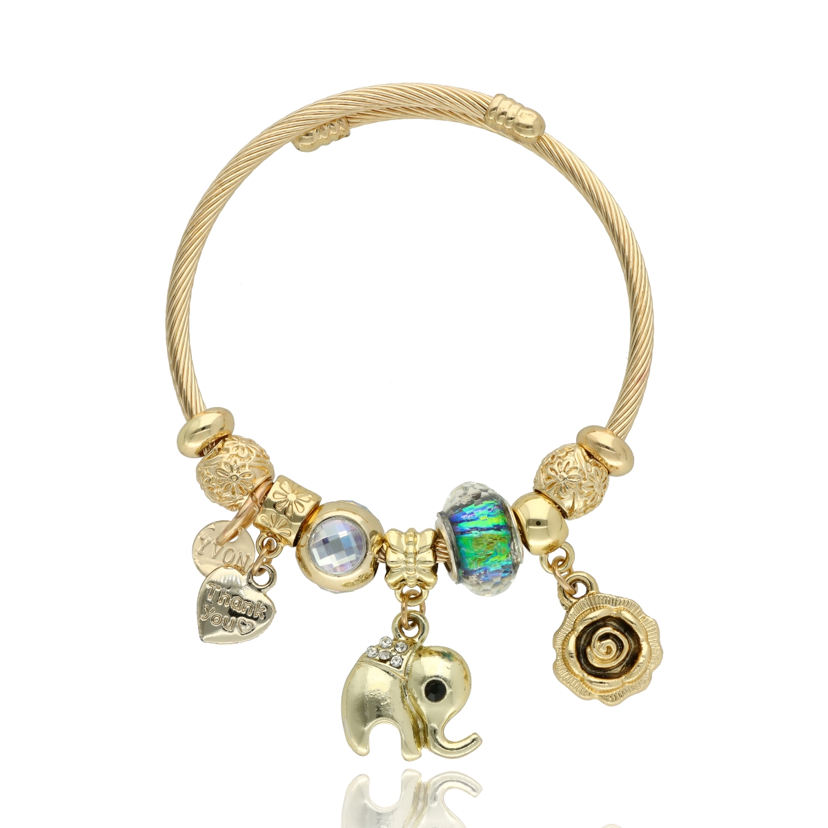 Urocza bransoletka wykonana ze stali szlachetnej (obręcz) oraz zamaku, szkła fasetowanego, ceramiki i emalii (czarmsy). W eleganckim PUDEŁECZKU GRATIS - idealny pomysł na prezent. Biżuteria hypoalergiczna.