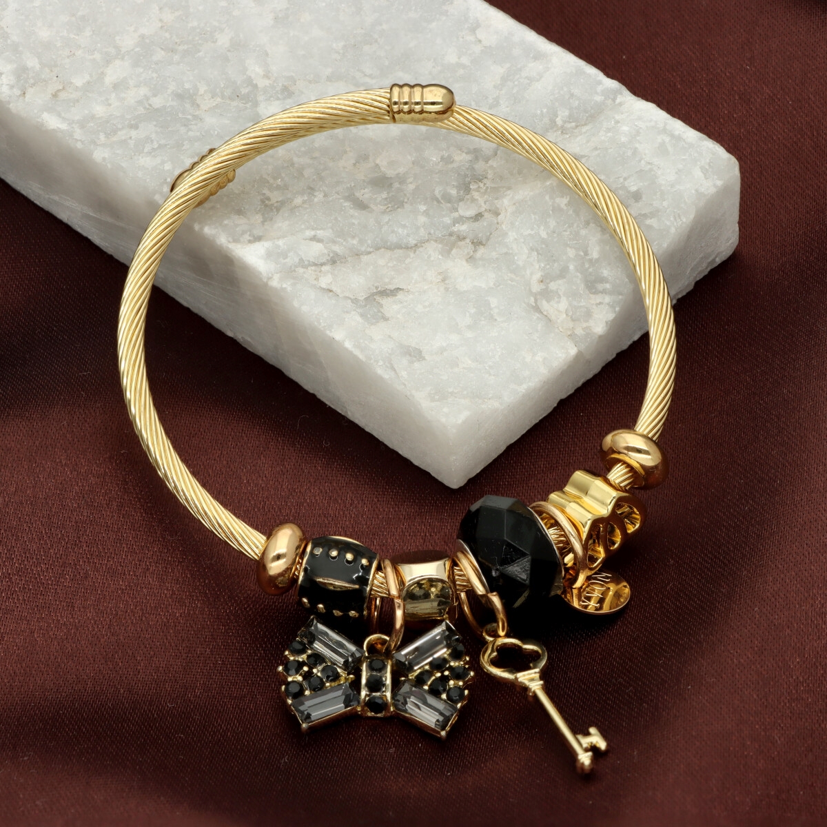 Urocza bransoletka wykonana ze stali szlachetnej (obręcz) oraz zamaku, szkła fasetowanego, ceramiki i emalii (czarmsy). W eleganckim PUDEŁECZKU GRATIS - idealny pomysł na prezent. Biżuteria hypoalergiczna.