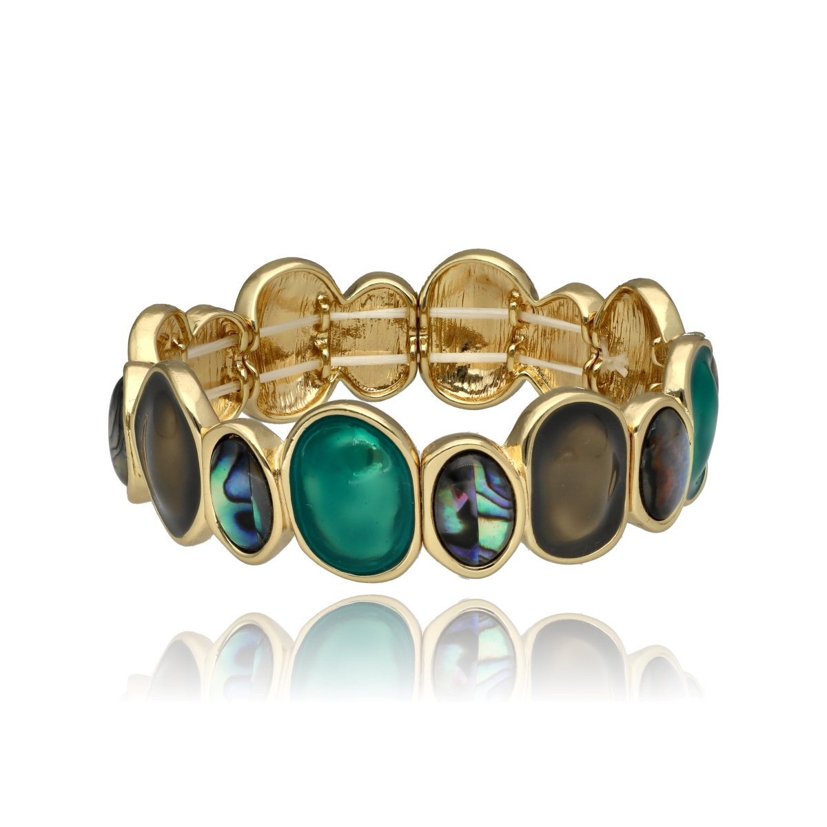 Bransoletka z żywicy, emalii i muszli naturalnej. Hipoalergiczna. Uniwersalna, rozciągliwa bransoletka stworzona z elementów z kolorowej żywicy, emalii oraz naturalnej muszli. Osadzona na elastycznej gumce, dopasowuje się do większości nadgarstków, zapewniając komfort i wygodę noszenia. Metalowe wykończenia są hipoalergiczne, dzięki czemu bransoletka jest odpowiednia także dla osób o wrażliwej skórze. W komplecie z pierścionkiem, kolczykami i naszyjnikiem z tej samej serii tworzy harmonijną, efektowną całość. Zapakowana w eleganckie pudełczko.