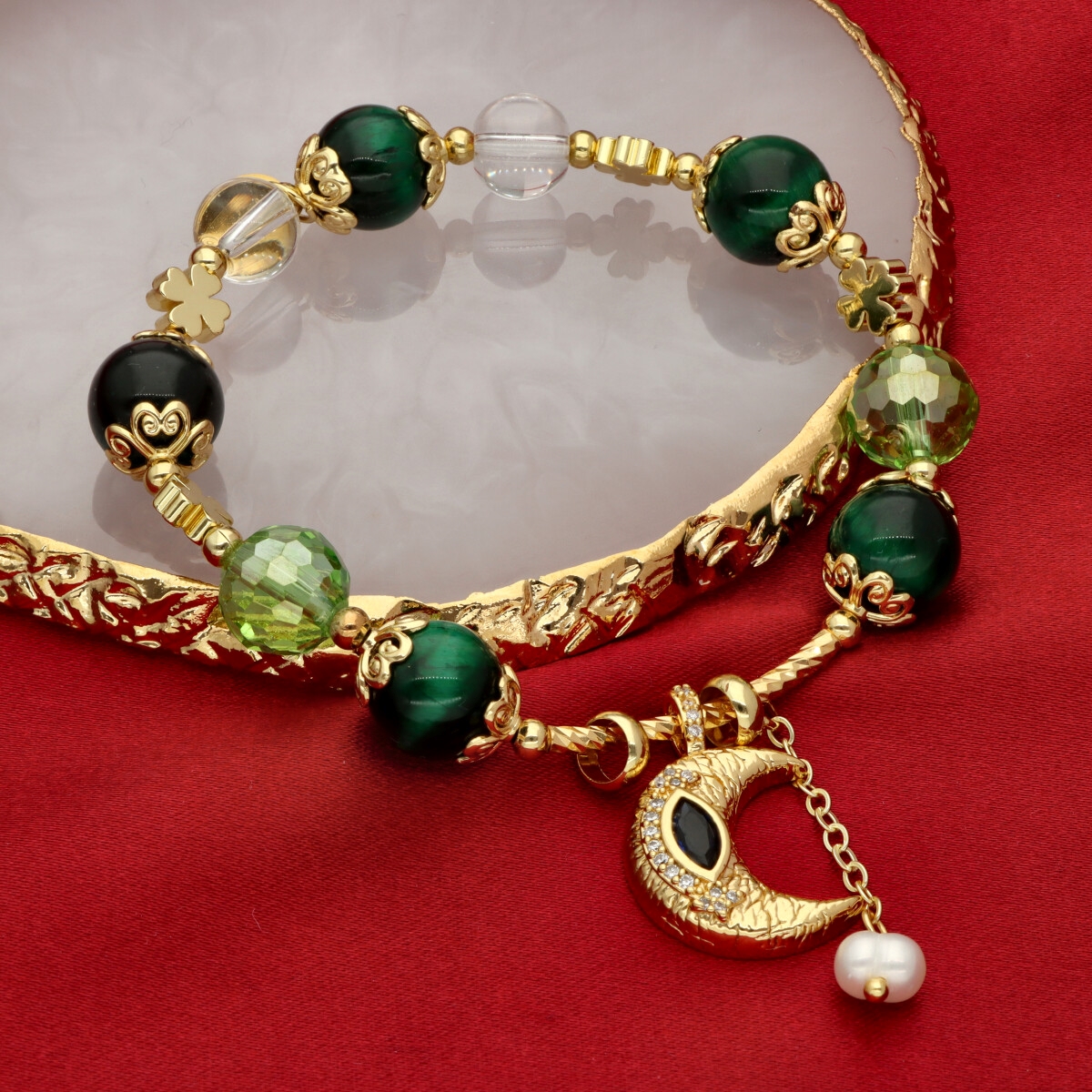 Ekskluzywna bransoletka z kolekcji LOVELY STONES wykonana z najwyższej jakości mosiądzu, zielonego tygrysiego oka, pereł, kryształu górskiego.