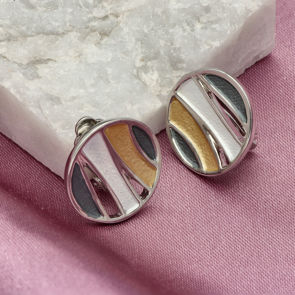 KLIPSY o średnicy ok. 2 cm w formie okrągłych, geometrycznych elementów. Nowoczesny wzór z nieregularnymi liniami tworzy ciekawy efekt wizualny i nadaje biżuterii wyrazistości.