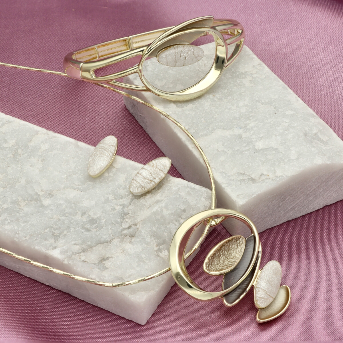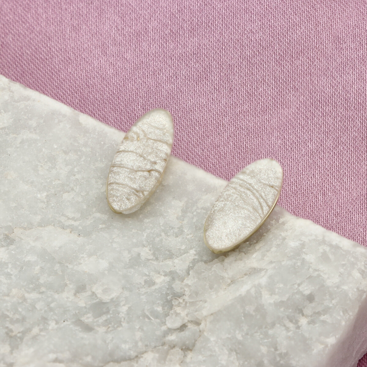 Opis produktu: Kolczyki o wielkości ok. 1,5 cm w formie smukłych, owalnych elementów. Minimalistyczna forma w połączeniu z wyrazistą strukturą nadaje im subtelnej elegancji. Wykonane z hipoalergicznego metalu (zamak – stop cynku, bezpieczny dla wrażliwej skóry) oraz żywicy z efektem głębi, która delikatnie odbija światło i nadaje im wyjątkowego charakteru. Do kompletu dostępny jest pasujący naszyjnik oraz bransoletka o tym samym indeksie numerycznym.