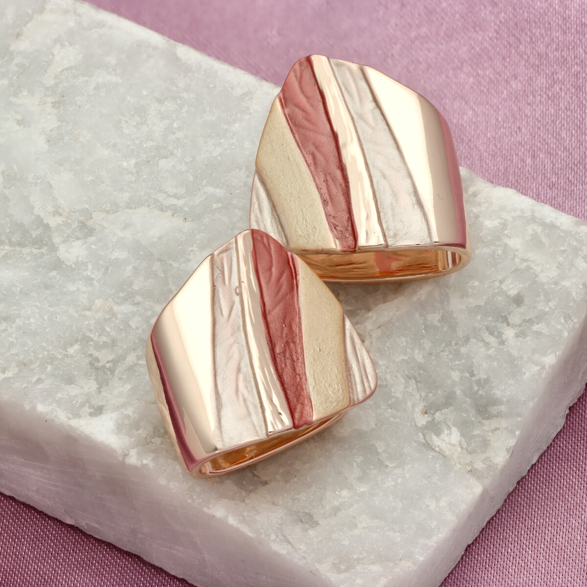 Kolczyki o wielkości ok. 2 cm w formie geometrycznych elementów z nieregularnym układem pasów. Nowoczesny design i wyrazisty wzór nadają im charakteru, a jednocześnie pozostają lekkie i wygodne w noszeniu.