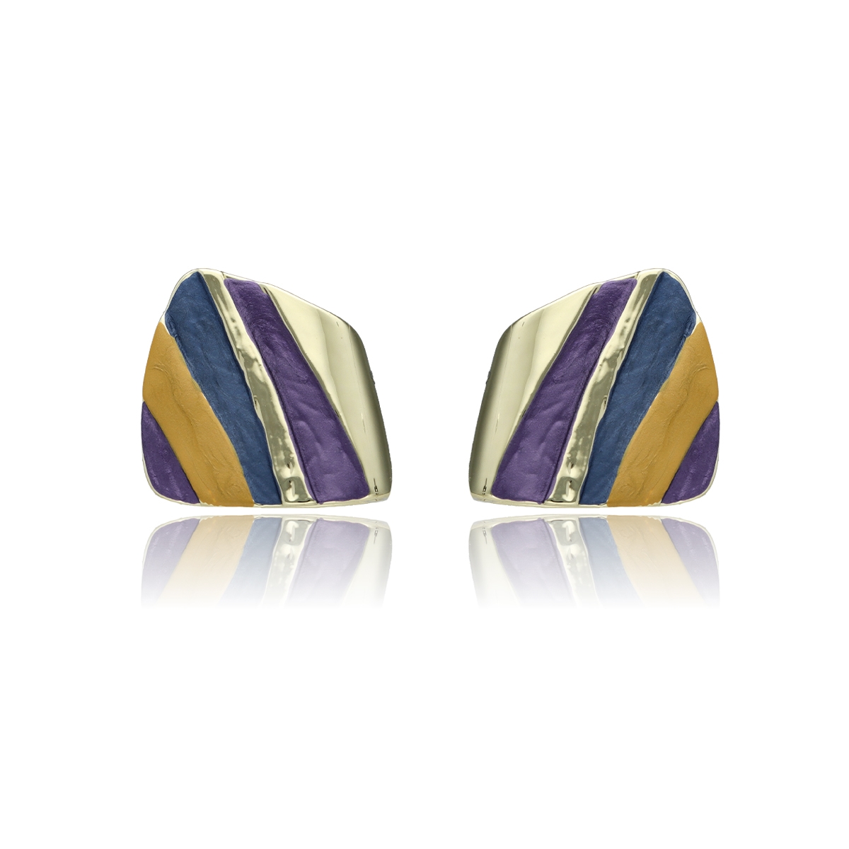 Kolczyki o wielkości ok. 2 cm w formie geometrycznych elementów z nieregularnym układem pasów. Nowoczesny design i wyrazisty wzór nadają im charakteru, a jednocześnie pozostają lekkie i wygodne w noszeniu.