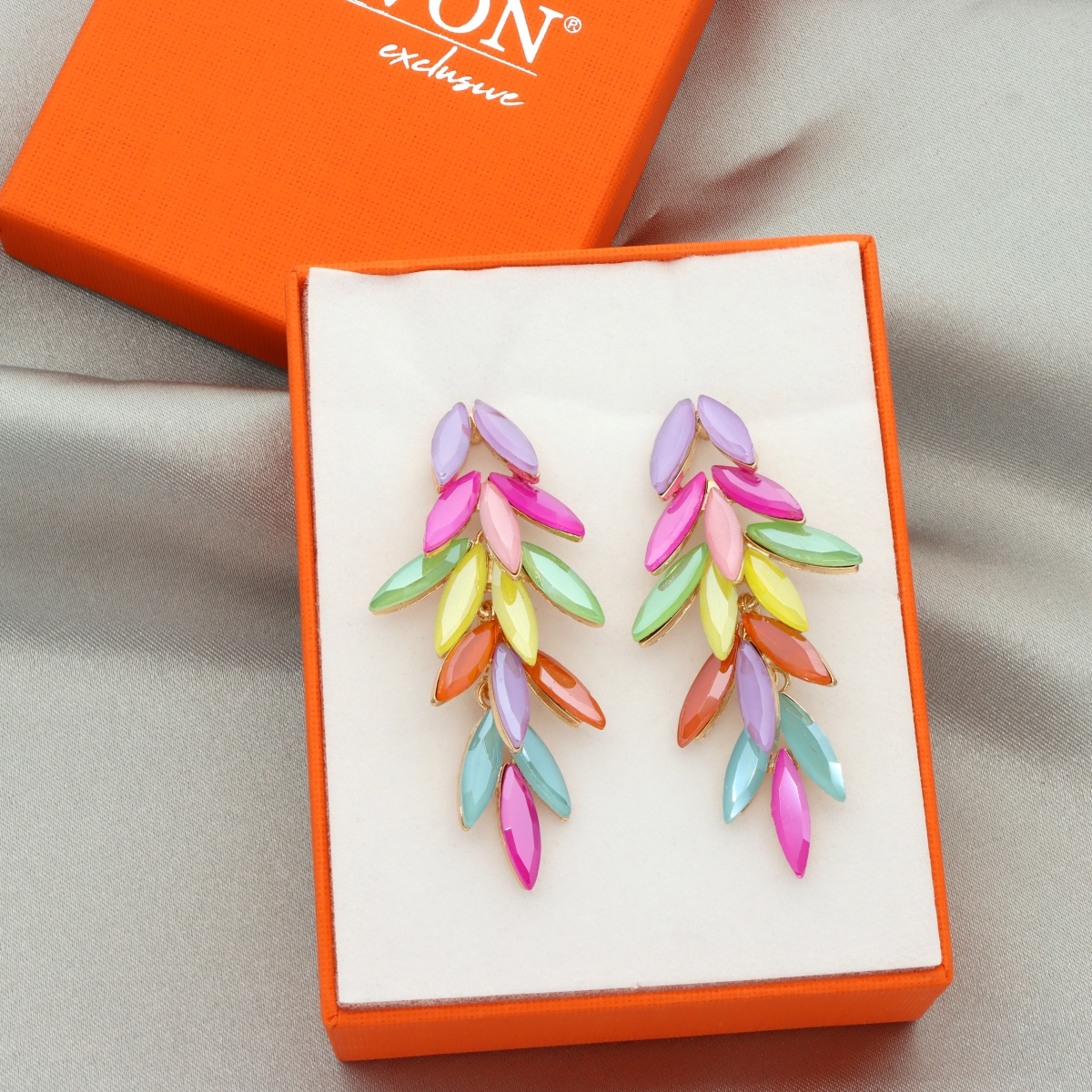 Efektowne letnie kolczyki z dymionego szkła fasetowanego. Soczysta, letnia kolorystyka. Biżuteria antyalergiczna. Długość ok. 6 cm. W pudełeczku (gratis).