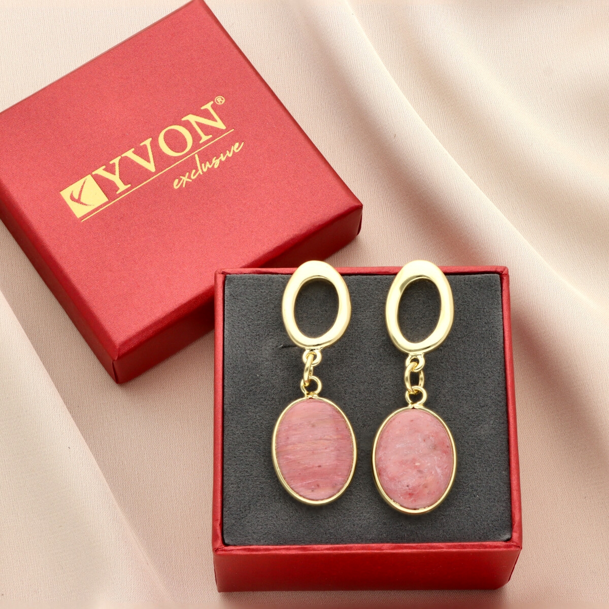Kolczyki z kamieniem naturalnym (rodonit) Opis produktu: Eleganckie kolczyki z naturalnym kamieniem rodonit to połączenie klasyki i nowoczesnej formy. Gładkie kamienie w różowo-malinowym odcieniu z naturalnymi przejściami w zestawieniu ze złotymi elementami tworzą wyrazistą, a jednocześnie uniwersalną kompozycję. Długość kolczyków: ok. 4 cm. Wykonane z hipoalergicznego mosiądzu, co zapewnia komfort noszenia i trwałość. Szukaj do kompletu naszyjnika, bransoletki i pierścionka o tym samym indeksie numerycznym. Biżuteria pakowana w eleganckie pudełko – idealna również na prezent.