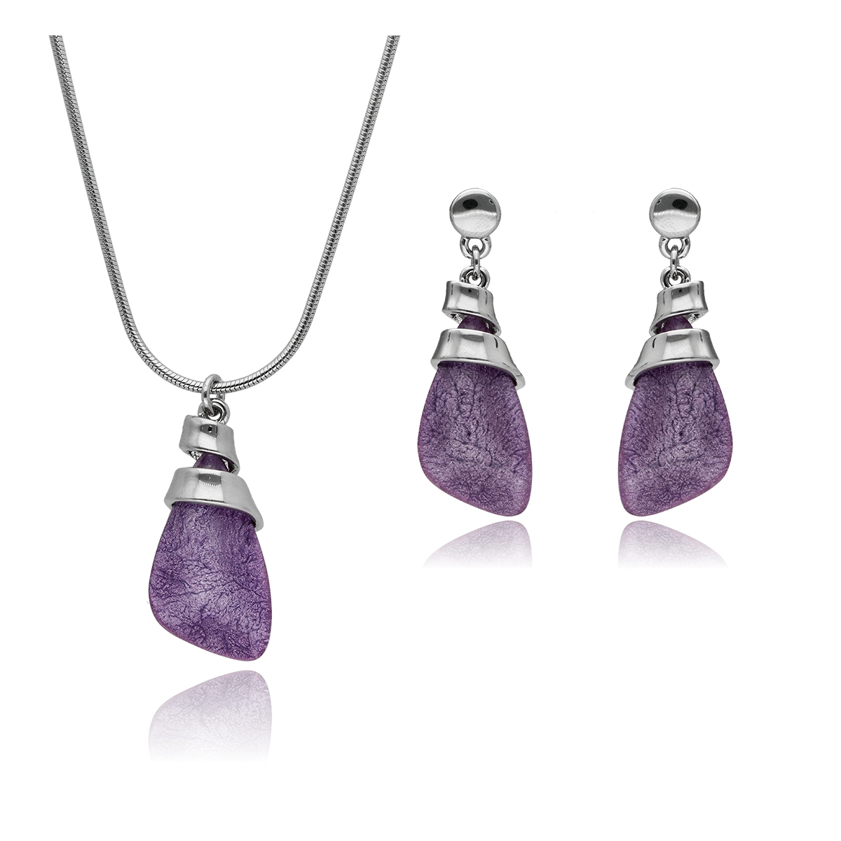 Komplet biżuterii składający się z naszyjnika oraz kolczyków, zapakowany w pudełko prezentowe. Wykonany z hipoalergicznego metalu oraz żywicy jubilerskiej. Lekka forma zapewnia komfort codziennego użytkowania. Długość naszyjnika wynosi 42 cm, dodatkowo 8 cm zawieszki. Długość kolczyków to około 3 cm. Specyfikacja: zestaw: naszyjnik + kolczyki materiał: hipoalergiczny metal, żywica jubilerska długość naszyjnika: 42 cm + 8 cm zawieszka długość kolczyków: ok. 3 cm pudełko prezentowe w zestawie