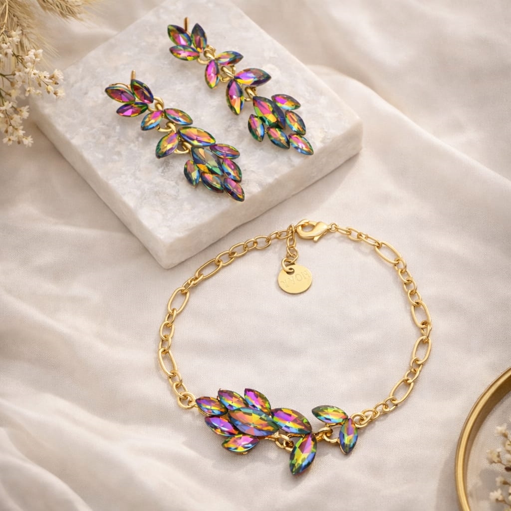 Biżuteria została wykonana z metalu HIPOALERGICZNEGO oraz szkła fasetowanego, dzięki czemu pięknie odbija światło i tworzy elegancki, szlachetny efekt. To idealna propozycja na przyjęcia, uroczystości rodzinne, wesela oraz inne wyjątkowe okazje.