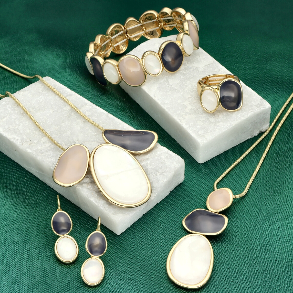 Długi, wysmuklający sylwetkę naszyjnik, wykonany z żywicy, emalii i muszli naturalnej – długość 45 cm + 8 cm regulacji. Ozoba ma 6,5 cm długości.