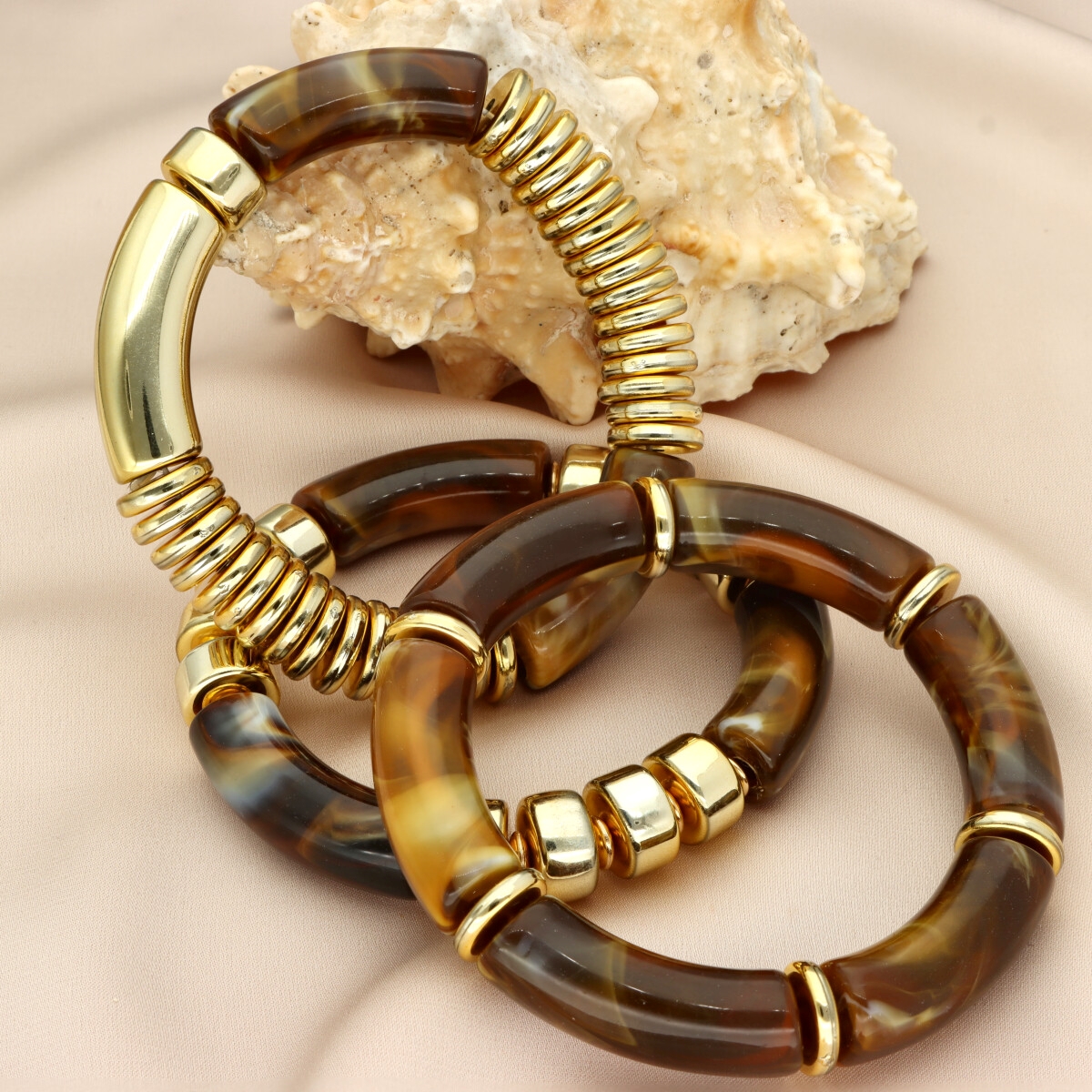 Zestawy bransolet YVON to wyraz nowoczesnej elegancji w wyjątkowo dopracowanej formie. Połączenie gładkiego, złotego metalu z dekoracyjną żywicą o subtelnym, marmurkowym efekcie tworzy kompozycję, która przyciąga uwagę, a jednocześnie pozostaje ponadczasowa. Każdy komplet został zaprojektowany tak, aby tworzyć spójną, stylową całość – różnorodność form i faktur nadaje bransoletkom unikatowego charakteru, a stonowana, klasyczna kolorystyka sprawia, że pasują zarówno do codziennych stylizacji, jak i bardziej eleganckich zestawień. Bransoletki wykonane są z metalu hipoalergicznego (zamak) oraz wysokiej jakości żywicy, dzięki czemu są komfortowe w noszeniu i przyjazne dla skóry. Standardowa średnica 6,5 cm zapewnia dobre dopasowanie do nadgarstka. Zestaw obejmuje wszystkie bransoletki widoczne na zdjęciu, tworząc gotową stylizację, która nie wymaga już żadnych dodatków – to biżuteria, która sama buduje cały look i nadaje mu wyrazistości.