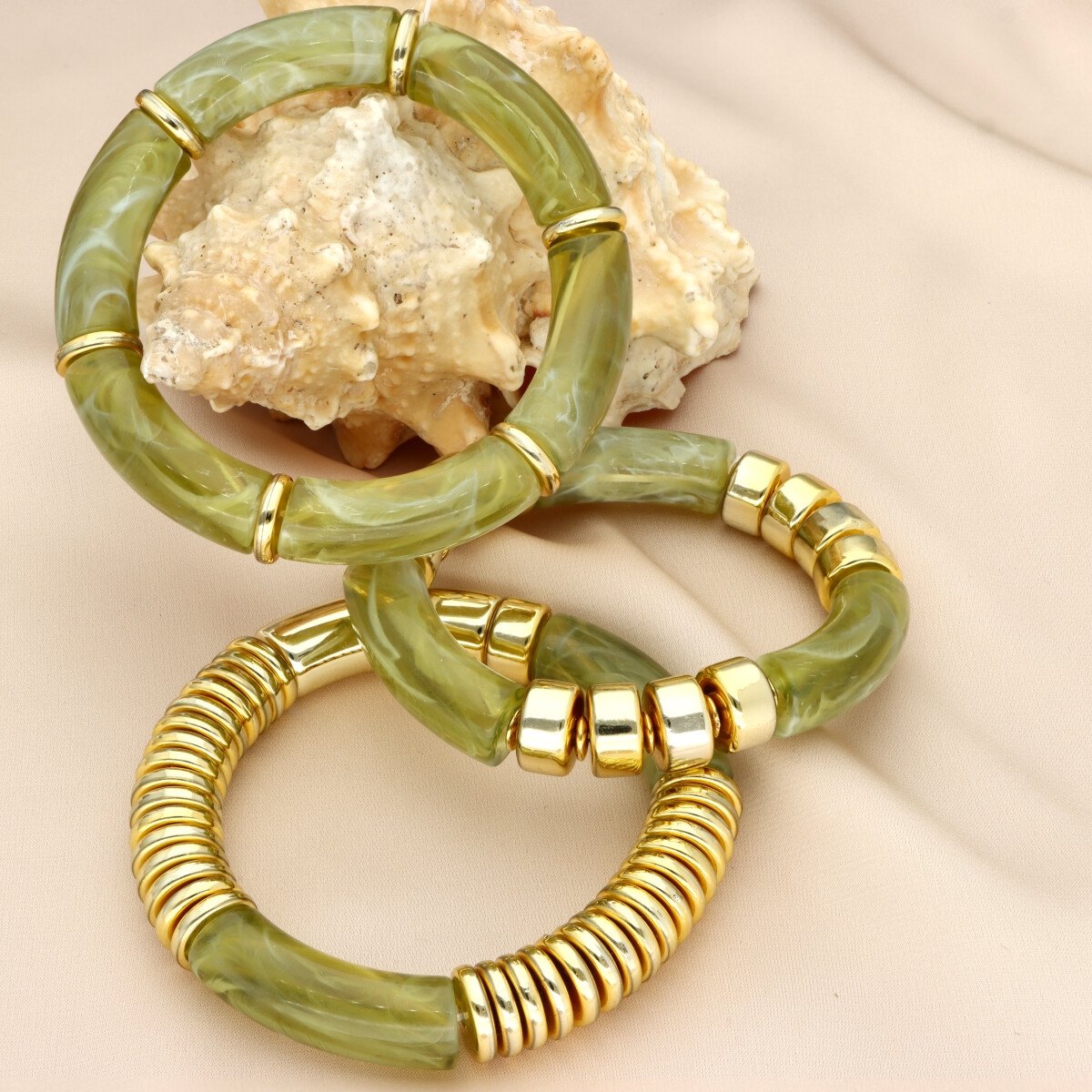 Zestawy bransolet YVON to wyraz nowoczesnej elegancji w wyjątkowo dopracowanej formie. Połączenie gładkiego, złotego metalu z dekoracyjną żywicą o subtelnym, marmurkowym efekcie tworzy kompozycję, która przyciąga uwagę, a jednocześnie pozostaje ponadczasowa. Każdy komplet został zaprojektowany tak, aby tworzyć spójną, stylową całość – różnorodność form i faktur nadaje bransoletkom unikatowego charakteru, a stonowana, klasyczna kolorystyka sprawia, że pasują zarówno do codziennych stylizacji, jak i bardziej eleganckich zestawień. Bransoletki wykonane są z metalu hipoalergicznego (zamak) oraz wysokiej jakości żywicy, dzięki czemu są komfortowe w noszeniu i przyjazne dla skóry. Standardowa średnica 6,5 cm zapewnia dobre dopasowanie do nadgarstka. Zestaw obejmuje wszystkie bransoletki widoczne na zdjęciu, tworząc gotową stylizację, która nie wymaga już żadnych dodatków – to biżuteria, która sama buduje cały look i nadaje mu wyrazistości.