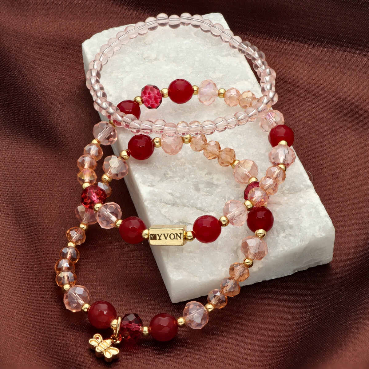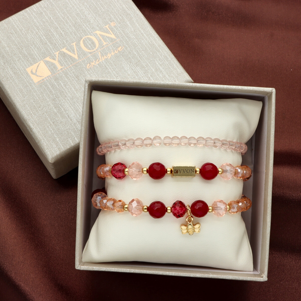 Zestaw trzech bransoletek z KAMIENIAMI NATURALNYMI (GRANAT), który łączy w sobie klasyczną elegancję i najwyższą jakość wykonania. Każdy element został starannie dobrany – od antyalergicznego mosiądzu, przez elementy z kamieni, aż po misternie fasetowane koraliki z kryształu górskiego. Subtelne połączenie tych materiałów tworzy niepowtarzalny, ponadczasowy dodatek. Bransoletki zapakowane są w eleganckie pudełeczko z miękką poduszeczką, co sprawia, że zestaw doskonale nadaje się na prezent.