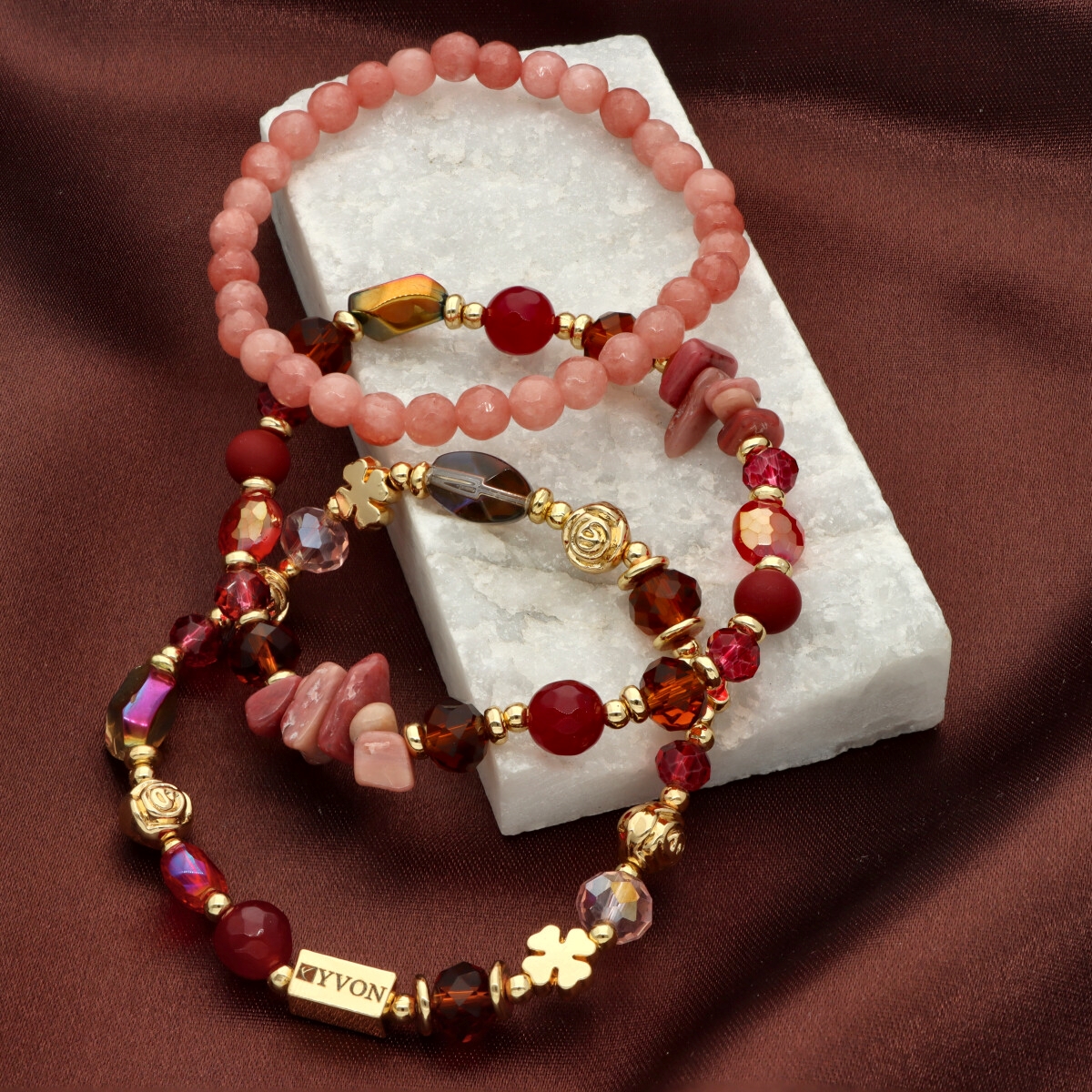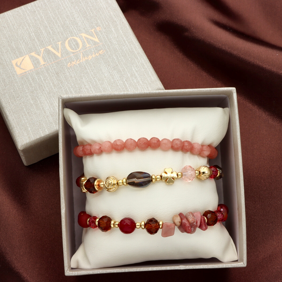 Zestaw trzech bransoletek z KAMIENIAMI NATURALNYMI (KWARC RÓŻOWY), który łączy w sobie klasyczną elegancję i najwyższą jakość wykonania. Każdy element został starannie dobrany – od antyalergicznego mosiądzu, przez elementy z kamieni, aż po misternie fasetowane koraliki z kryształu górskiego. Subtelne połączenie tych materiałów tworzy niepowtarzalny, ponadczasowy dodatek. Bransoletki zapakowane są w eleganckie pudełeczko z miękką poduszeczką, co sprawia, że zestaw doskonale nadaje się na prezent.