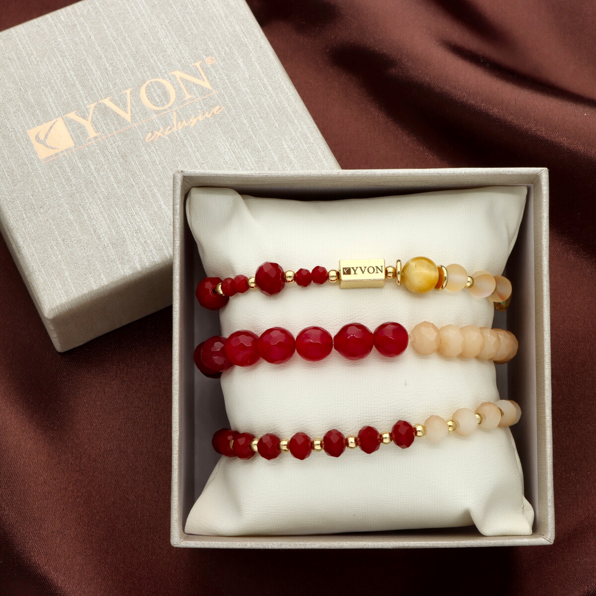 Zestaw trzech bransoletek z KAMIENIAMI NATURALNYMI (jaspis czerwony, tygrysie oko złote, labradoryt), który łączy w sobie klasyczną elegancję i najwyższą jakość wykonania. Każdy element został starannie dobrany – od antyalergicznego mosiądzu, przez elementy z kamieni, aż po misternie fasetowane koraliki z kryształu górskiego. Subtelne połączenie tych materiałów tworzy niepowtarzalny, ponadczasowy dodatek. Bransoletki zapakowane są w eleganckie pudełeczko z miękką poduszeczką, co sprawia, że zestaw doskonale nadaje się na prezent.