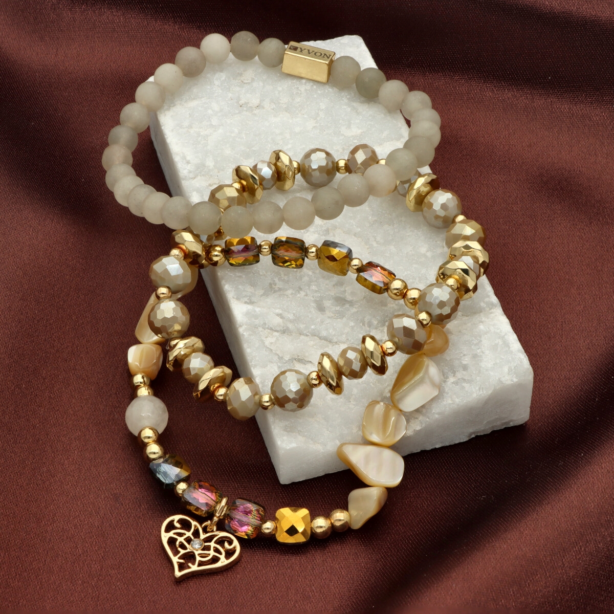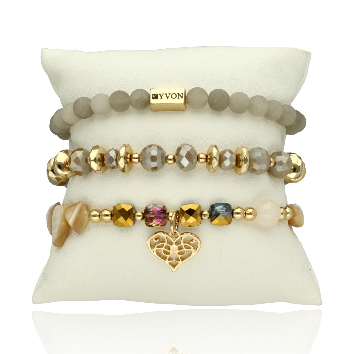 Zestaw trzech bransoletek z KAMIENIAMI NATURALNYMI (kamień księżycowy, muszla), który łączy w sobie klasyczną elegancję i najwyższą jakość wykonania. Każdy element został starannie dobrany – od antyalergicznego mosiądzu, przez elementy z kamieni, aż po misternie fasetowane koraliki z kryształu górskiego. Subtelne połączenie tych materiałów tworzy niepowtarzalny, ponadczasowy dodatek. Bransoletki zapakowane są w eleganckie pudełeczko z miękką poduszeczką, co sprawia, że zestaw doskonale nadaje się na prezent.