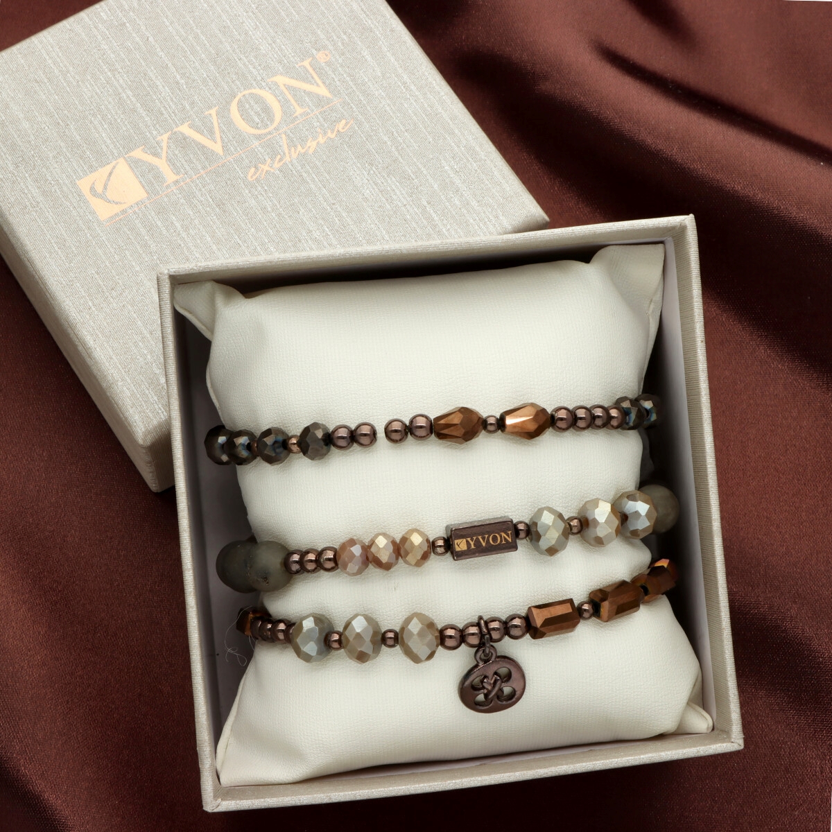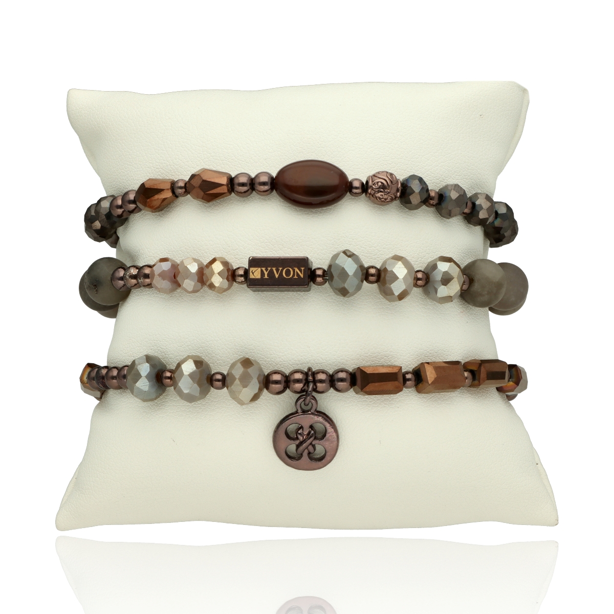 Zestaw trzech bransoletek z KAMIENIAMI NATURALNYMI (obsydian, agat szary), który łączy w sobie klasyczną elegancję i najwyższą jakość wykonania. Każdy element został starannie dobrany – od antyalergicznego mosiądzu, przez elementy z kamieni, aż po misternie fasetowane koraliki z kryształu górskiego. Subtelne połączenie tych materiałów tworzy niepowtarzalny, ponadczasowy dodatek. Bransoletki zapakowane są w eleganckie pudełeczko z miękką poduszeczką, co sprawia, że zestaw doskonale nadaje się na prezent.