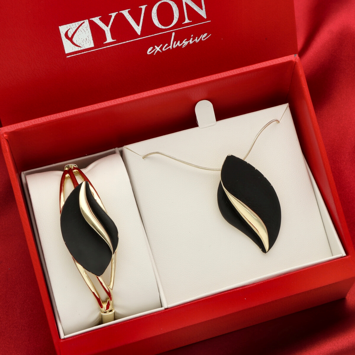Naszyjnik i bransoleta tworzą spójny, harmonijny komplet, idealny do eleganckich stylizacji i wieczorowych zestawów. Każdy zestaw pakowany jest w duże, ekskluzywne pudełko prezentowe YVON, zaprojektowane tak, aby pomieścić cały komplet i podkreślić jego luksusowy charakter.