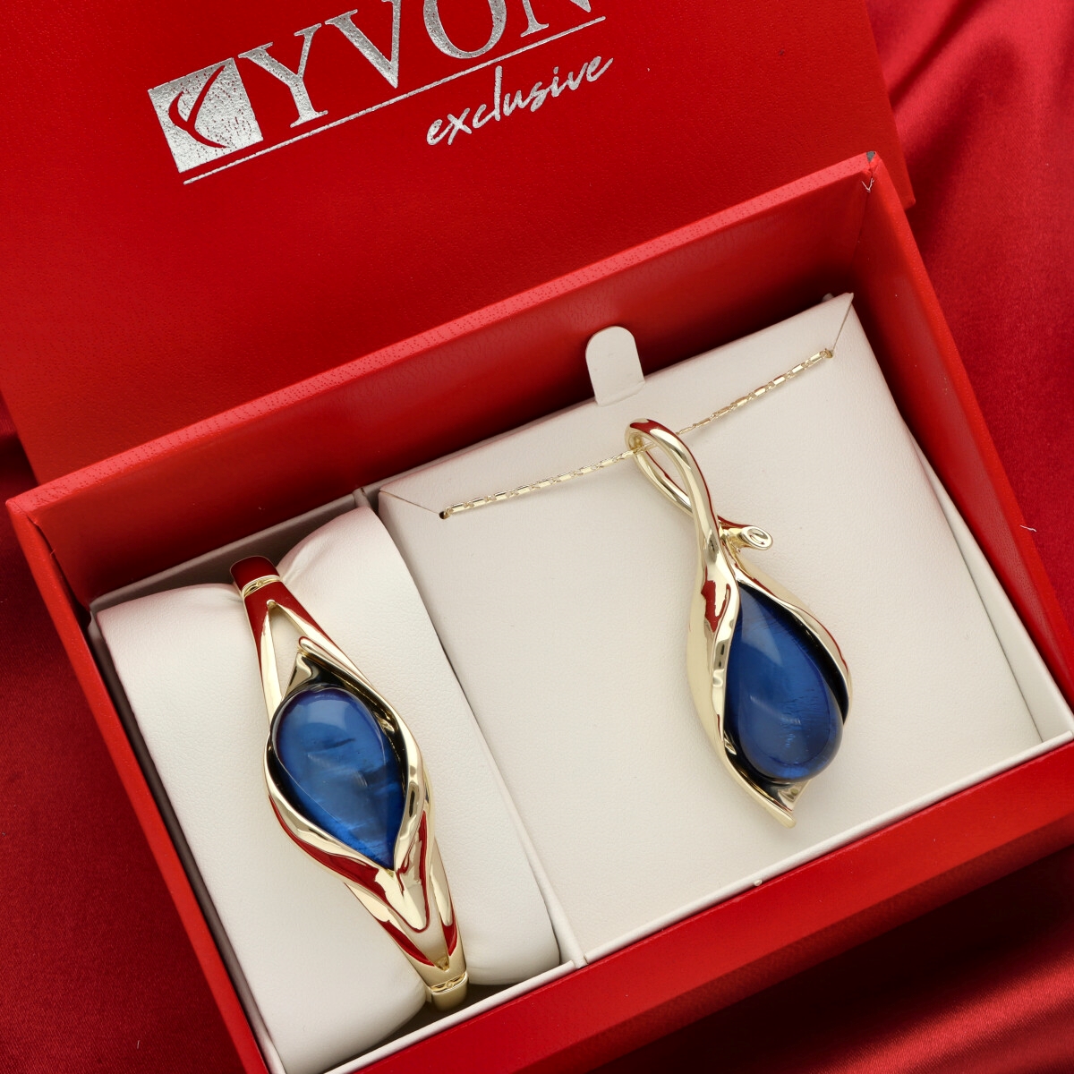 Naszyjnik i bransoleta tworzą spójny, harmonijny komplet, idealny do eleganckich stylizacji i wieczorowych zestawów. Każdy zestaw pakowany jest w duże, ekskluzywne pudełko prezentowe YVON, zaprojektowane tak, aby pomieścić cały komplet i podkreślić jego luksusowy charakter.