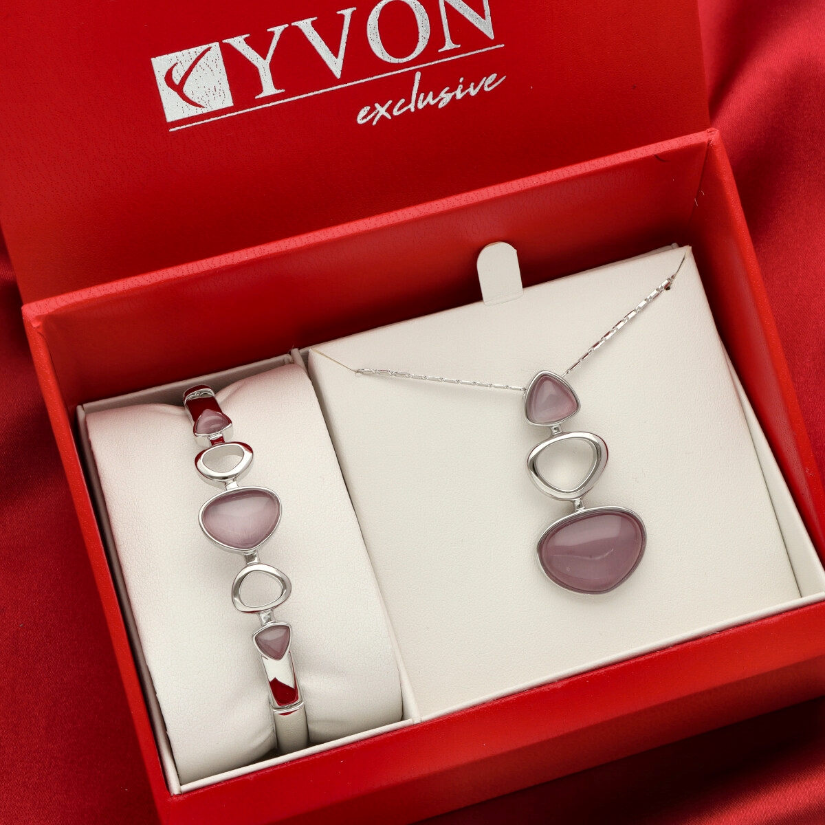 Naszyjnik i bransoleta tworzą spójny, harmonijny komplet, idealny do eleganckich stylizacji i wieczorowych zestawów. Każdy zestaw pakowany jest w duże, ekskluzywne pudełko prezentowe YVON, zaprojektowane tak, aby pomieścić cały komplet i podkreślić jego luksusowy charakter.