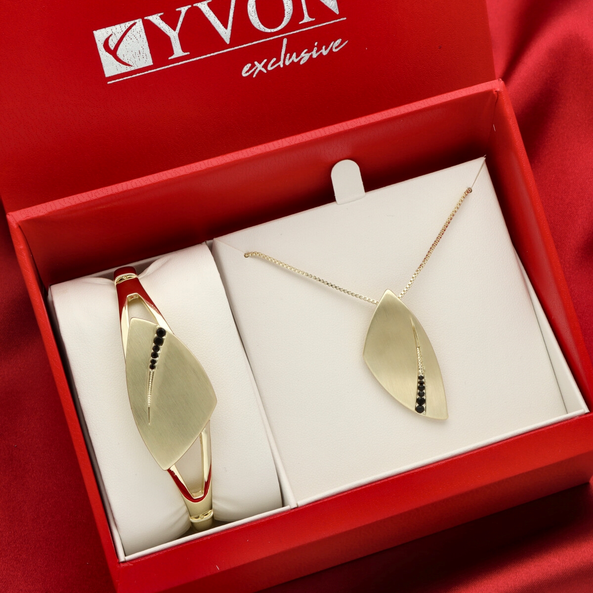 Naszyjnik i bransoleta tworzą spójny, harmonijny komplet, idealny do eleganckich stylizacji i wieczorowych zestawów. Każdy zestaw pakowany jest w duże, ekskluzywne pudełko prezentowe YVON, zaprojektowane tak, aby pomieścić cały komplet i podkreślić jego luksusowy charakter.