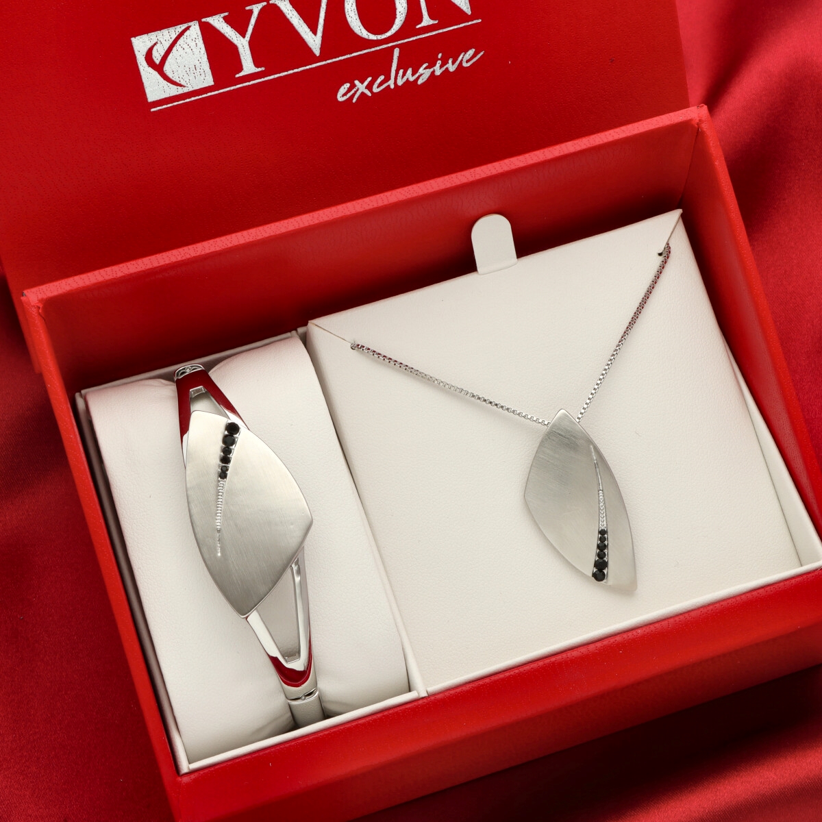 Naszyjnik i bransoleta tworzą spójny, harmonijny komplet, idealny do eleganckich stylizacji i wieczorowych zestawów. Każdy zestaw pakowany jest w duże, ekskluzywne pudełko prezentowe YVON, zaprojektowane tak, aby pomieścić cały komplet i podkreślić jego luksusowy charakter.